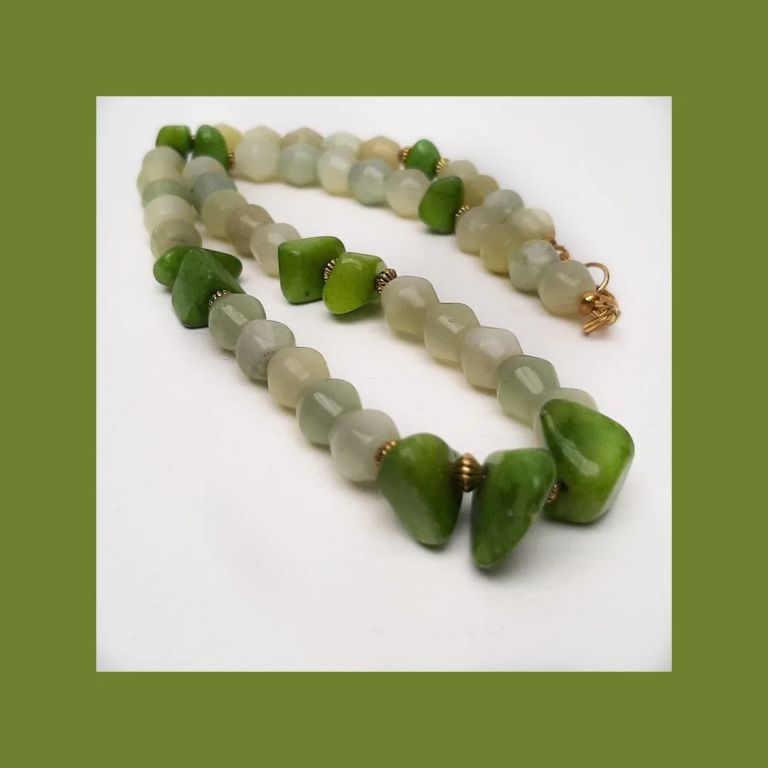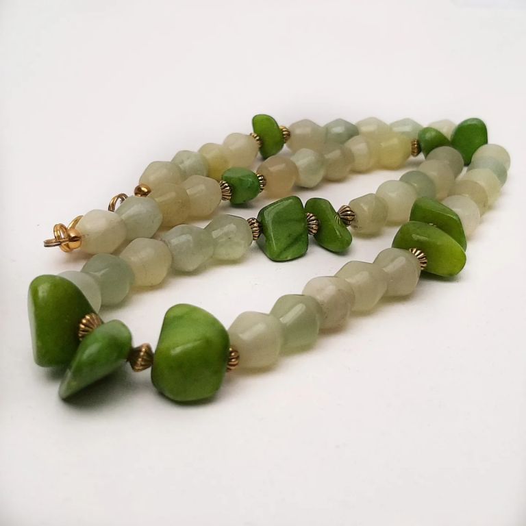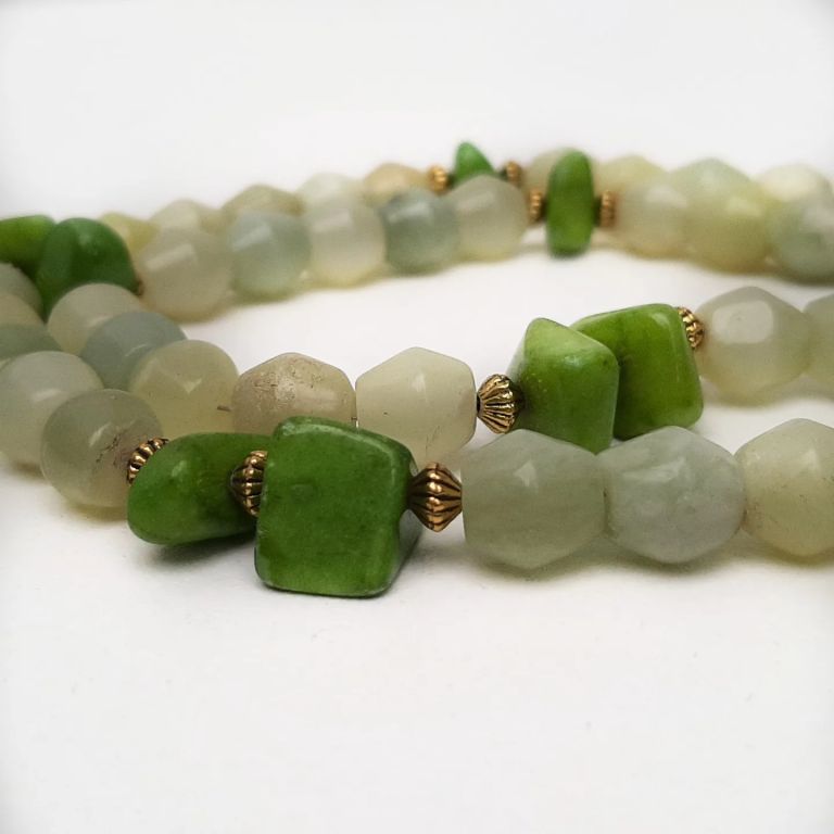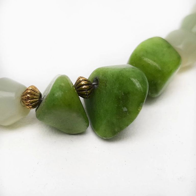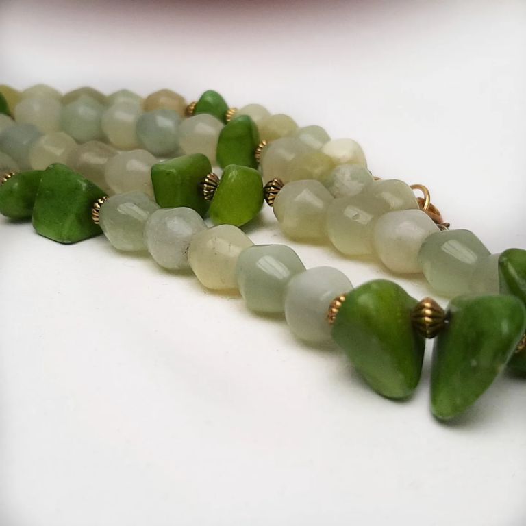 Ketting van jade (tonnetjes), olivijn quartz (onregelmatig) en goudkleurige spacers.