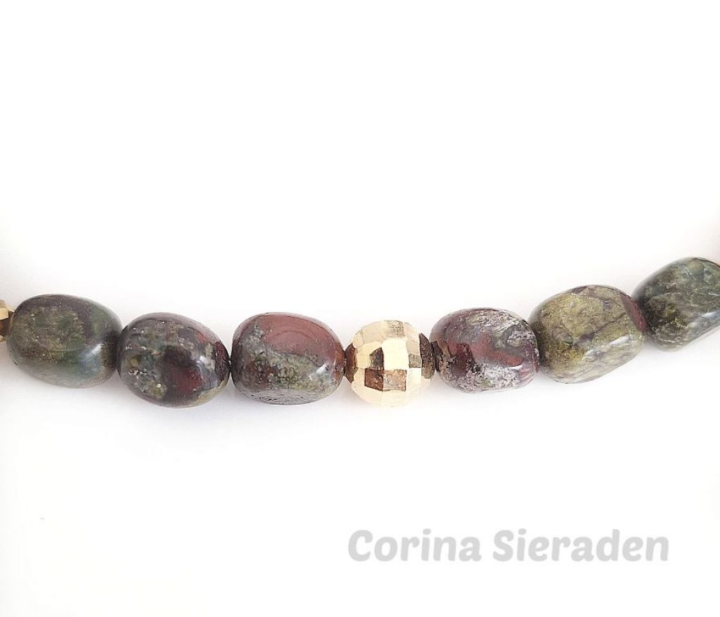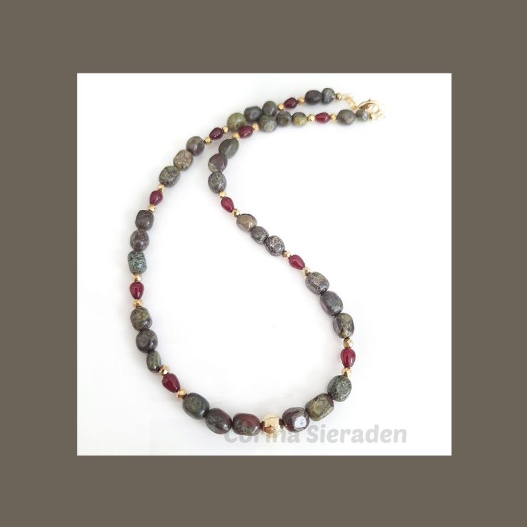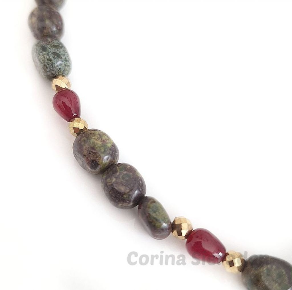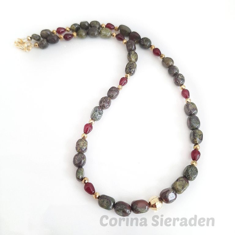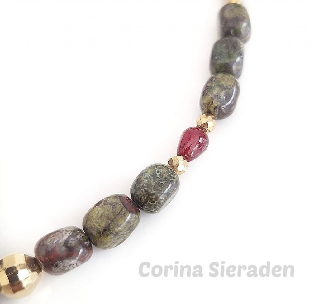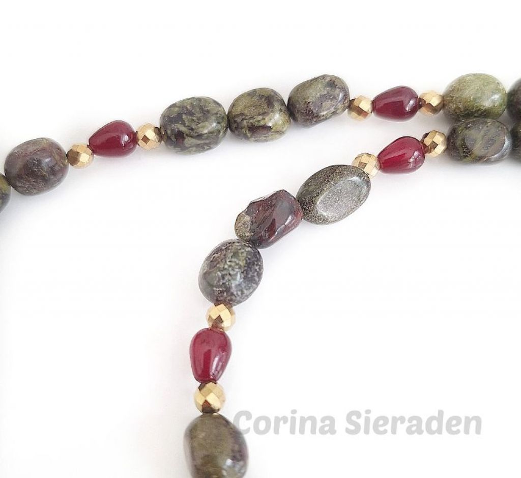 Ketting van dragon blood (onregelmatig 8 a 9 mm), bloedrode chalcedoon (druppel 6x9 mm) en goudkleurige, facetgeslepen hematiet spacers.