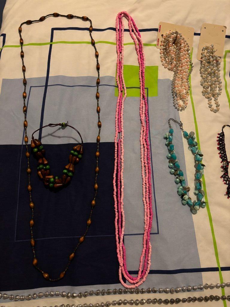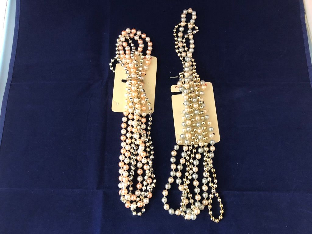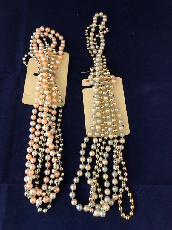 Clock house halsketting set kunststof parels gekleurd 2 sets Twee complete sets van Clock House kettingen. De eerste set heeft parel kralen in parelmoer wit en rosé en een zilverkleurige ketting. De tweede set heeft ...
