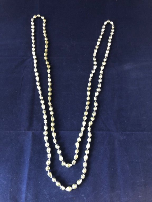 Halsketting zilverkleurig kralen gedraaid peervorm 77 cm Zeer lange ketting met grijze kralen die verschillend van vorm zijn ( gedraaid, peervormig, appelvormig ). Lengte is 77 cm, dus ook makkelijk in twee lagen te dragen ...
