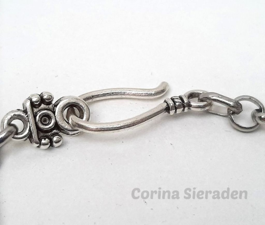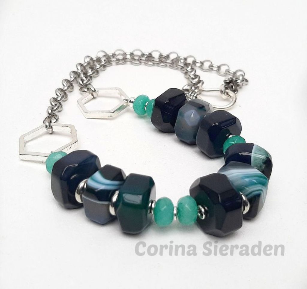 Unieke ketting van facetgeslepen agaat nuggets, facetgeslepen jade, en tibetaans zilver, met jasseron en stoer haakslot.