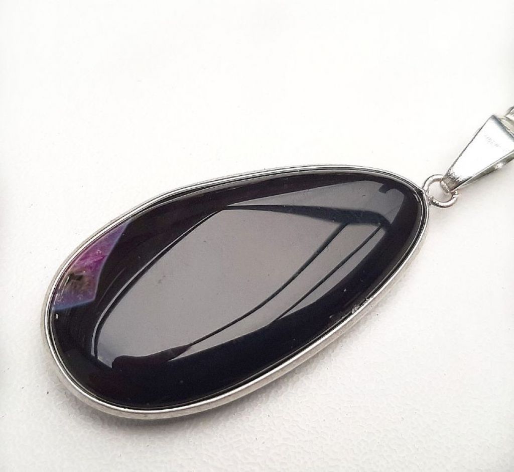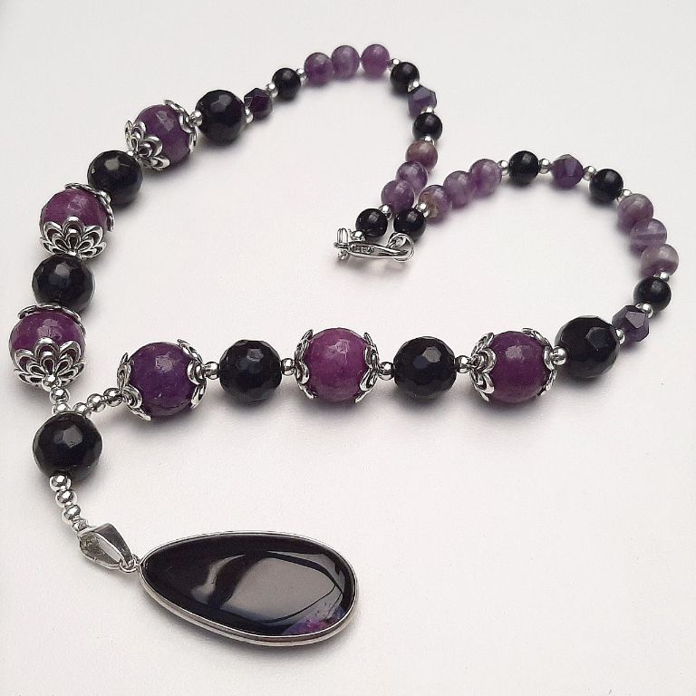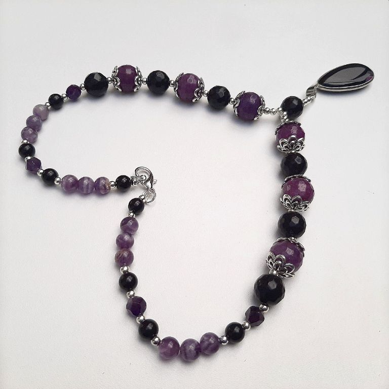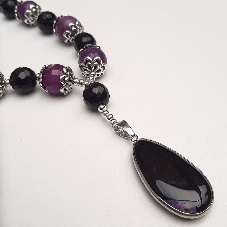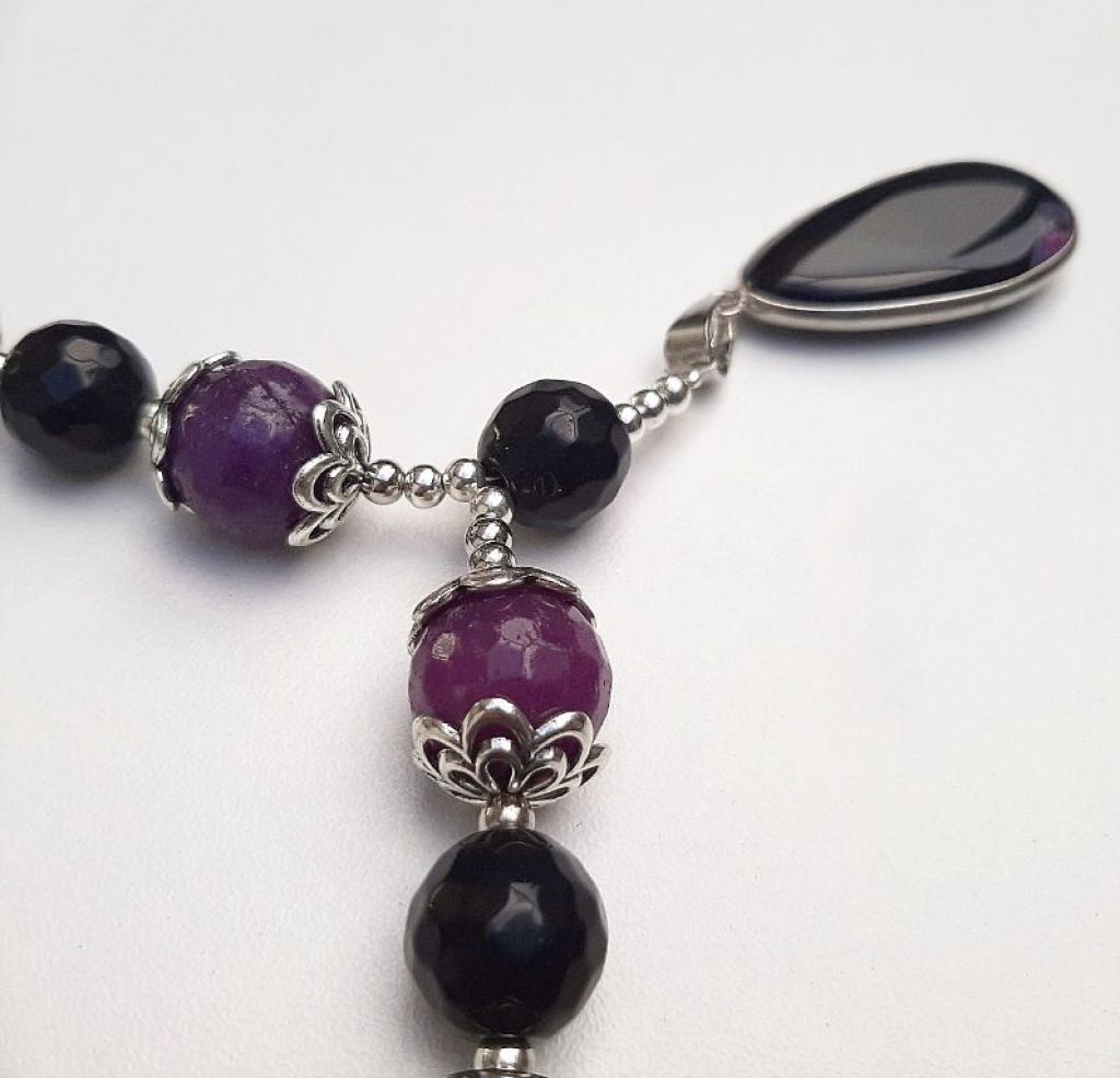 Feestelijke ketting van facetgeslepen agaat, amethyst, facetgeslepen amethyst, obsidiaan, facetgeslepen obsidiaan en tibetaans zilver, met prachtige hanger van zwarte agaat met paars accentje. Lengte ketting is inclusief hanger.