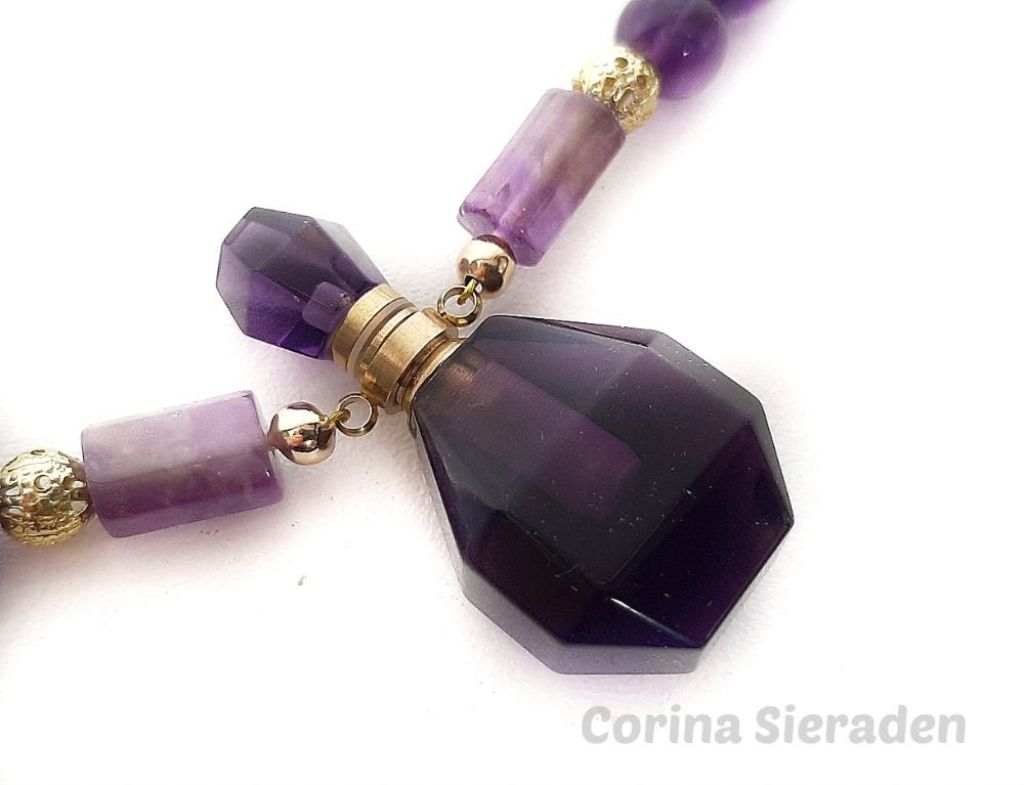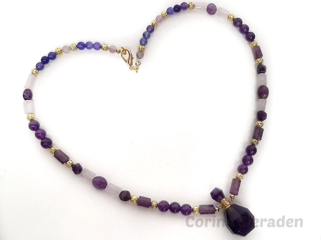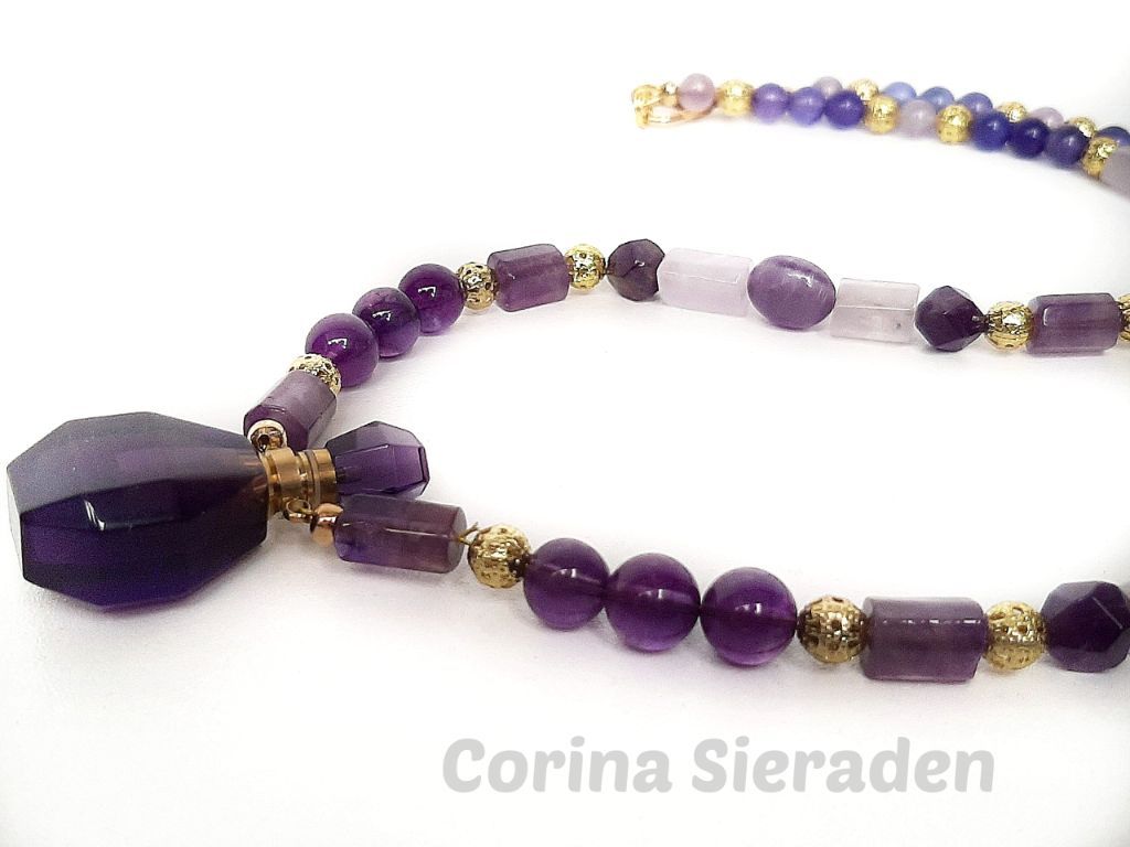 Unieke ketting van amethyst (rond, onregelmatige, facetgeslepen en cilinder) en goudkleurige filigraan kralen, met prachtige hanger parfumflesje. Lengte: 58 cm.