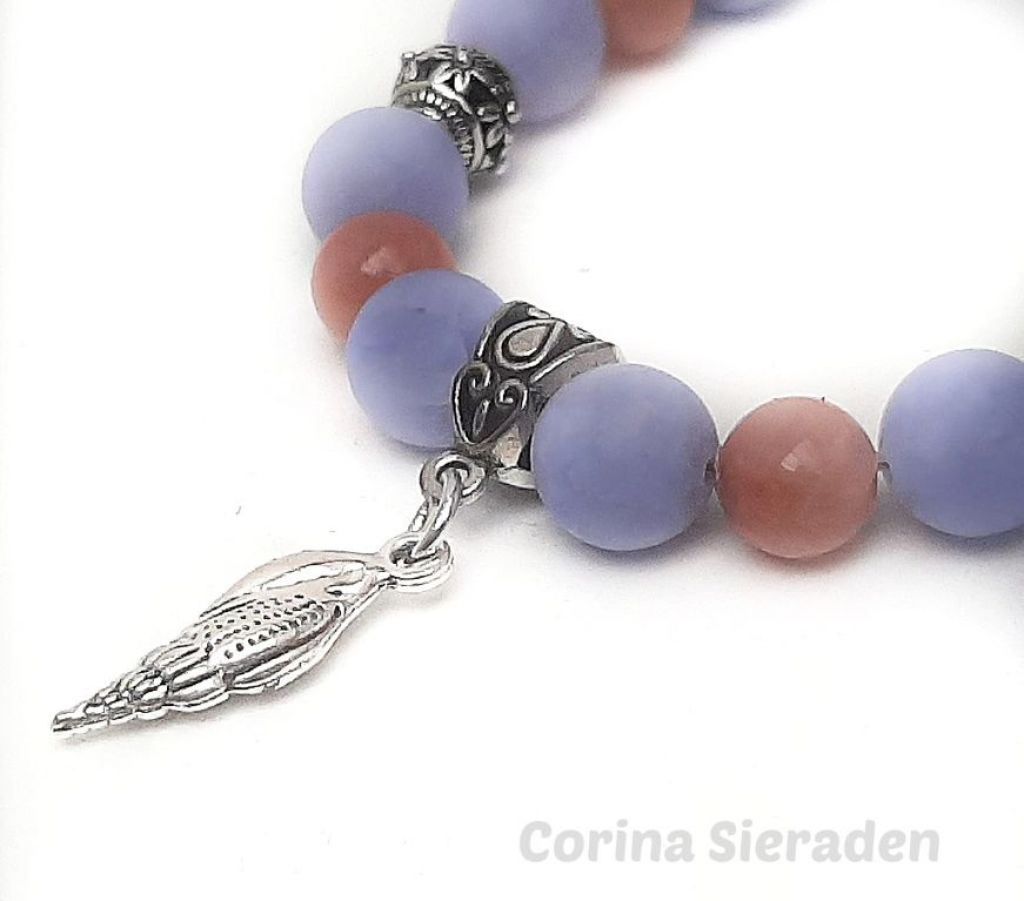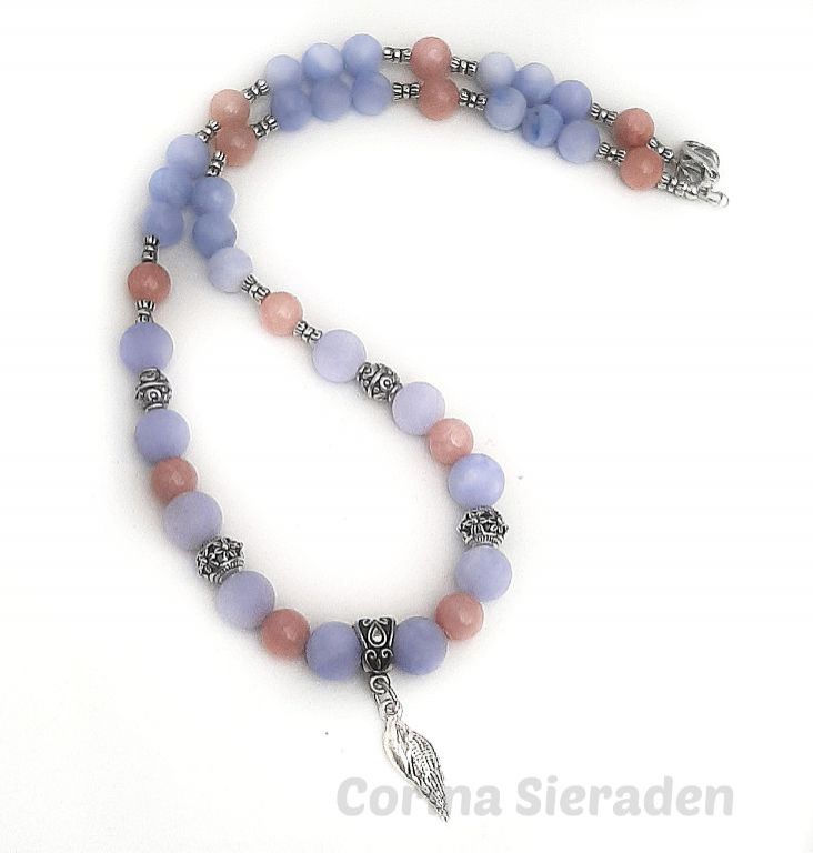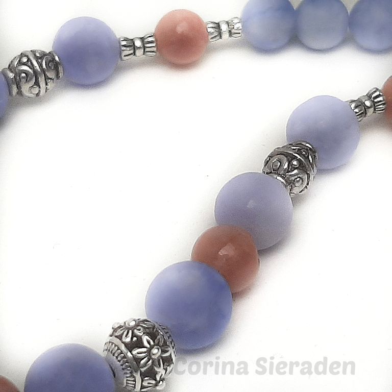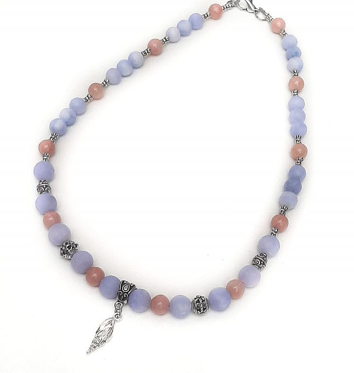 Elegante ketting van blauwe chalcedoon angeliet, zonnesteen en tibetaans zilver, met bedel schelp. Lengte: 51 cm.
