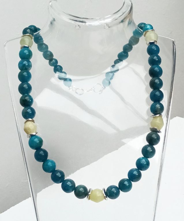Elegante ketting van ocean apatiet, jade tonnetjes en tibetaans zilver.