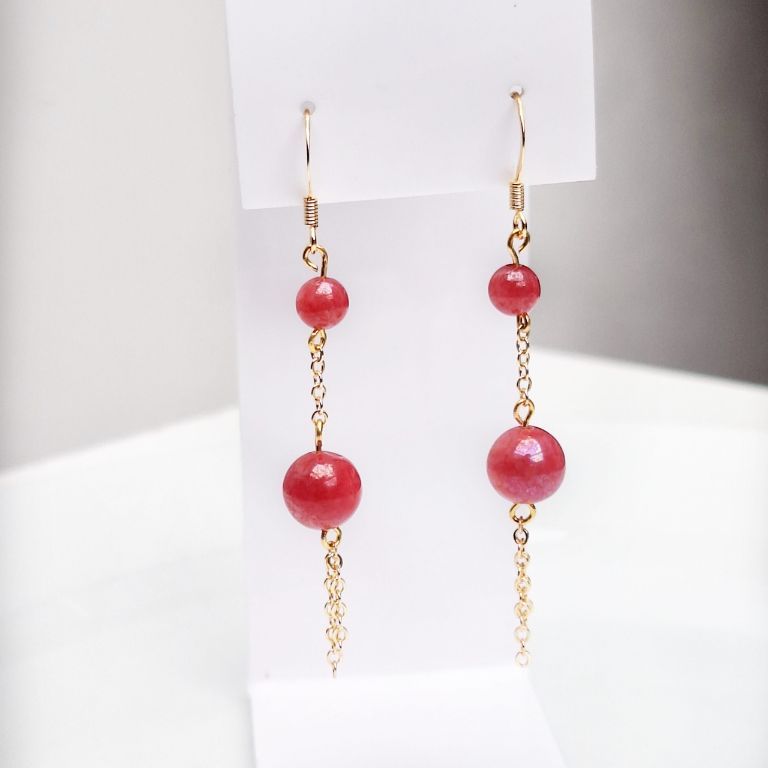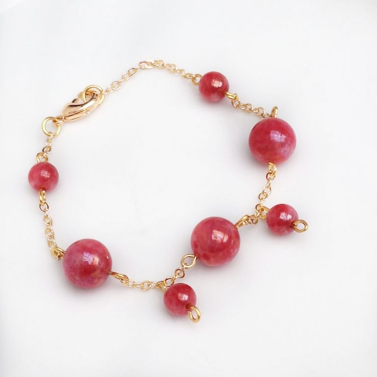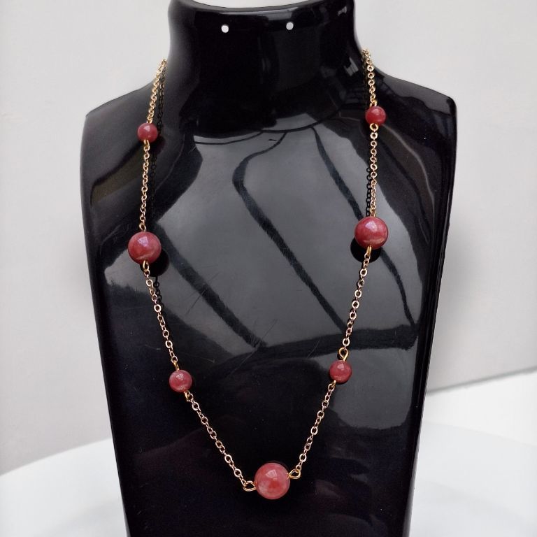 CORINA SIERADEN Ketting van dragon blood (onregelmatig 8 a 9 mm), bloedrode chalcedoon (druppel 6x9 mm) en goudkleurige, facetgeslepen hematiet spacers. Dragon blood, een prachtige steen met warme kleuren. Lengte: 50 cm. Prijs: ...