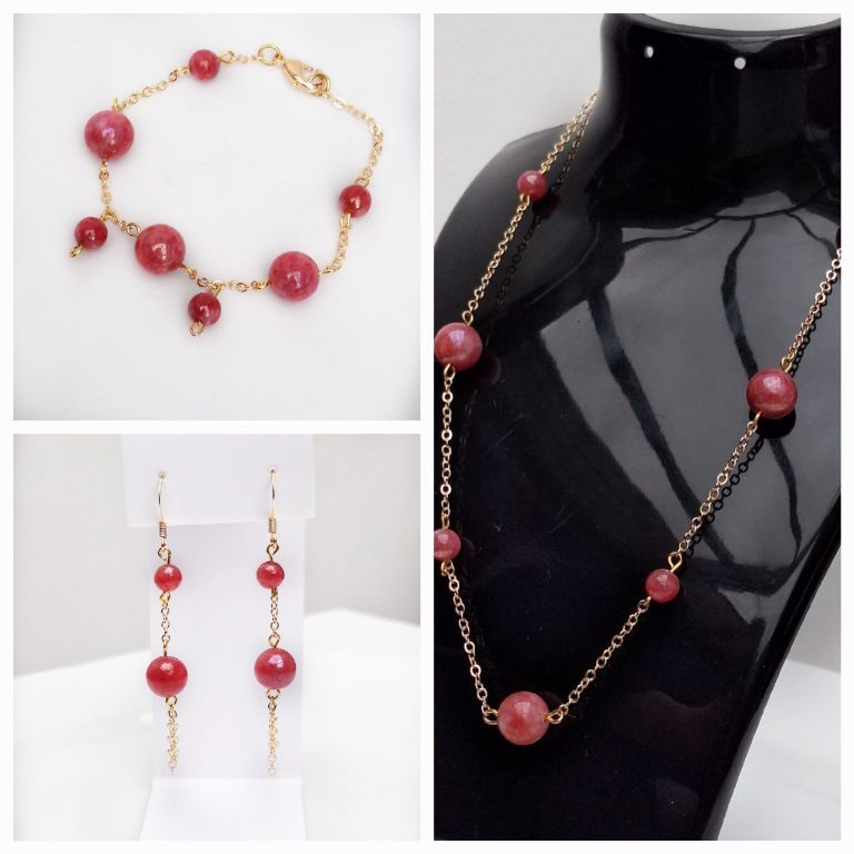 Elegante sieradenset bestaande uit een ketting, armband en oorhangers van electroplated rhodoniet en messing.