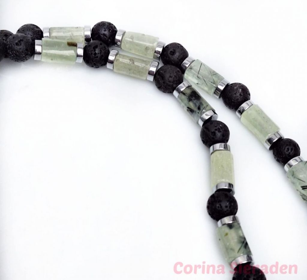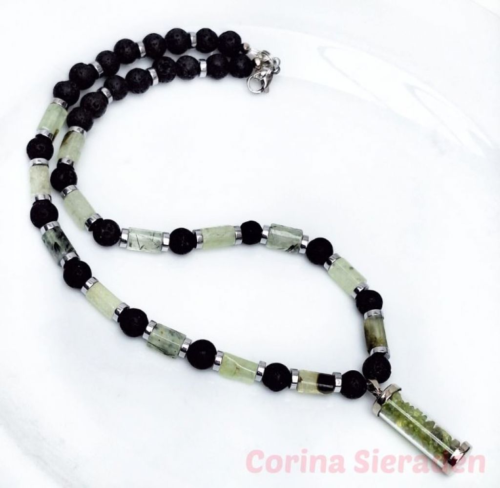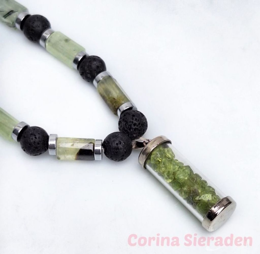 Deze unieke, handgemaakte ketting van prehniet (facetgeslepen cilinder), lavasteen en hematiet spacers heeft een prachtige, glazen hanger (buisje), gevuld met prehniet snippers.