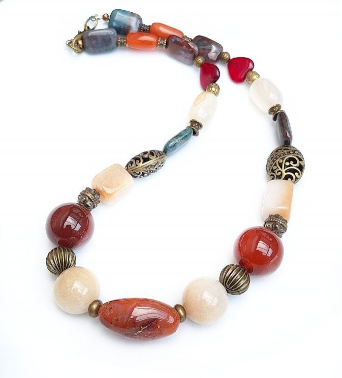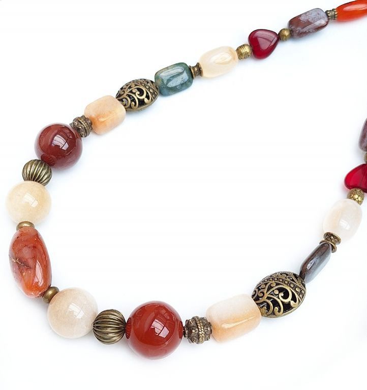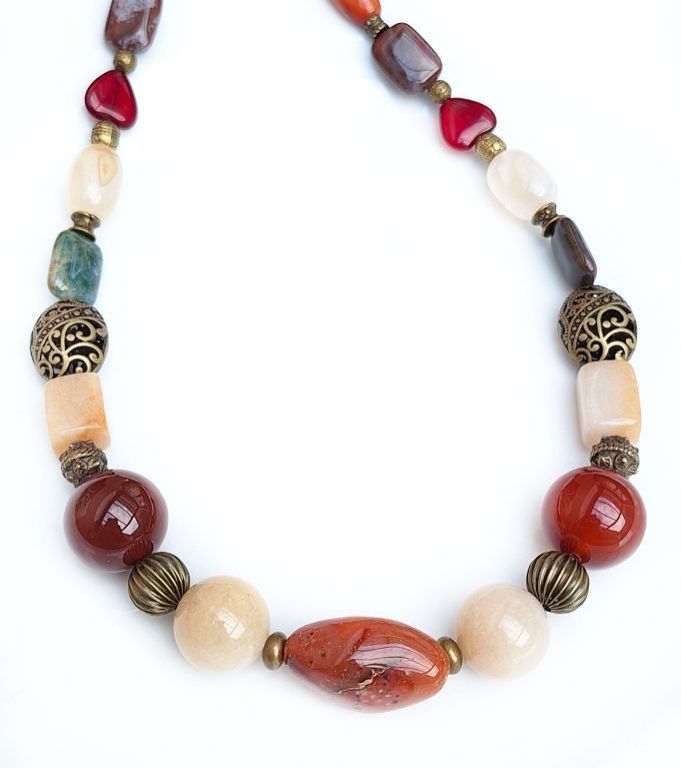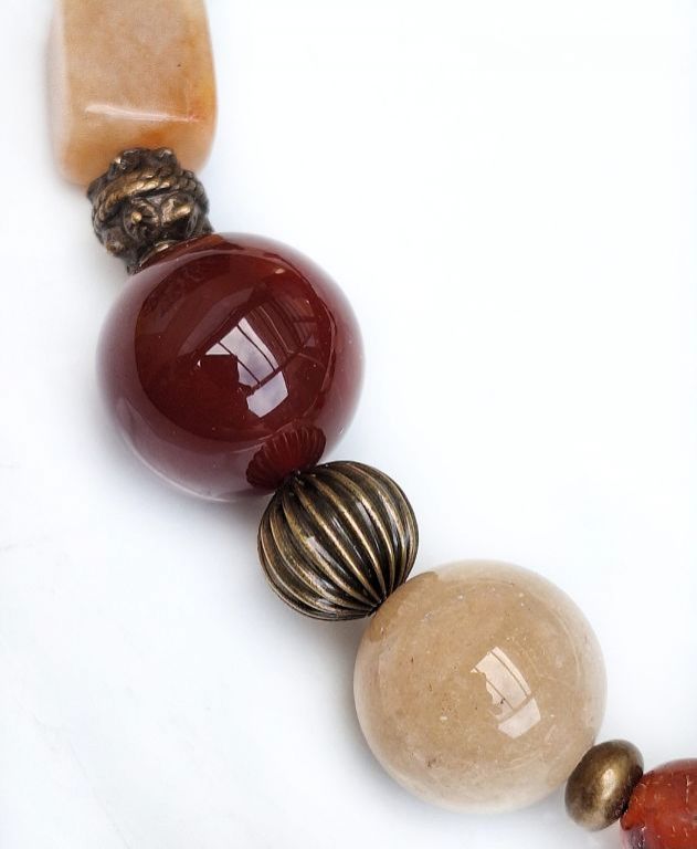 Stoere ketting van verschillende natuurstenen (waaronder: agaat, carneool en sneeuwquartz) en brons.
