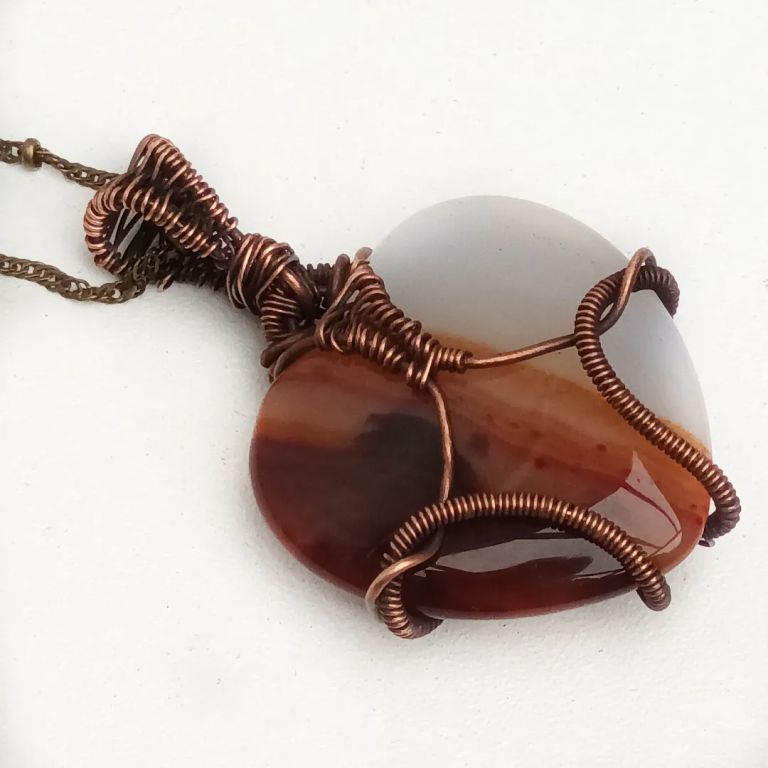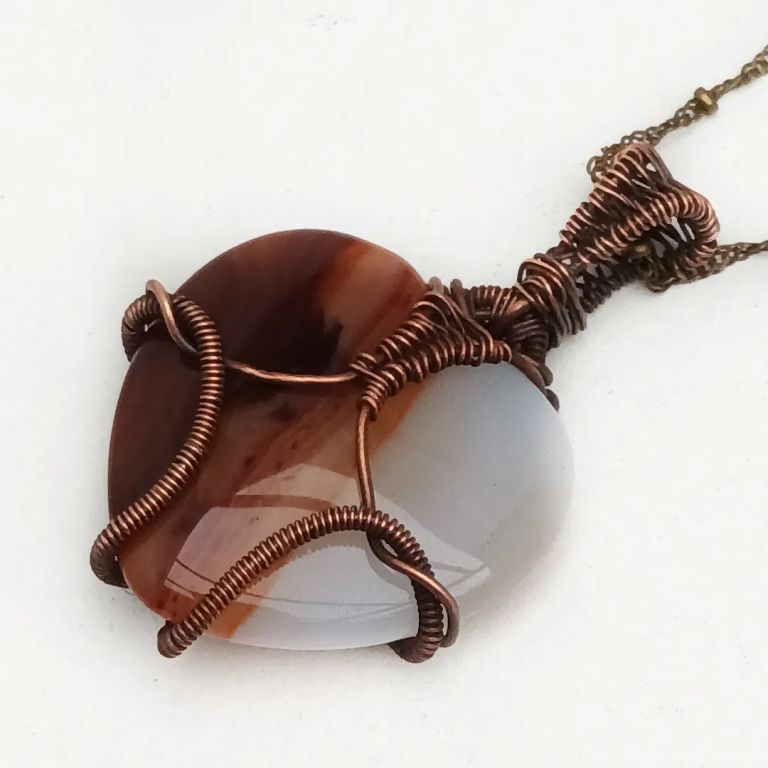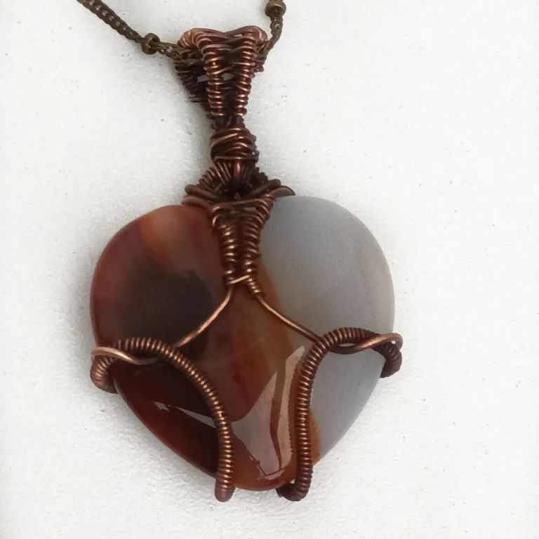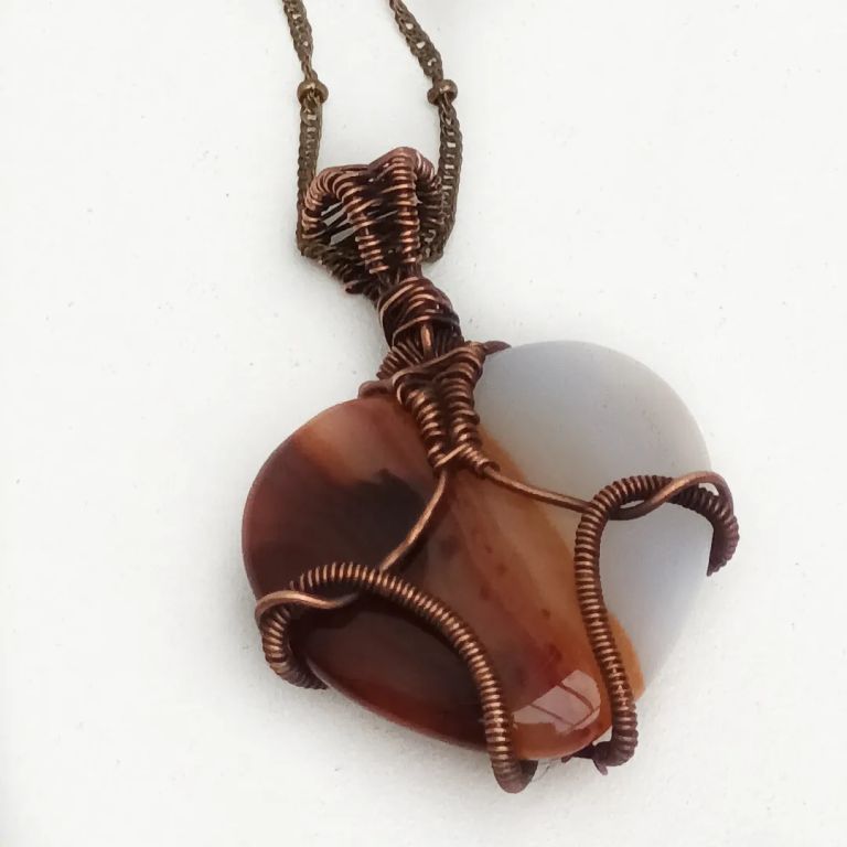 Wire wrapped hanger met hartvormige agaat in geoxideerd koperdraad.