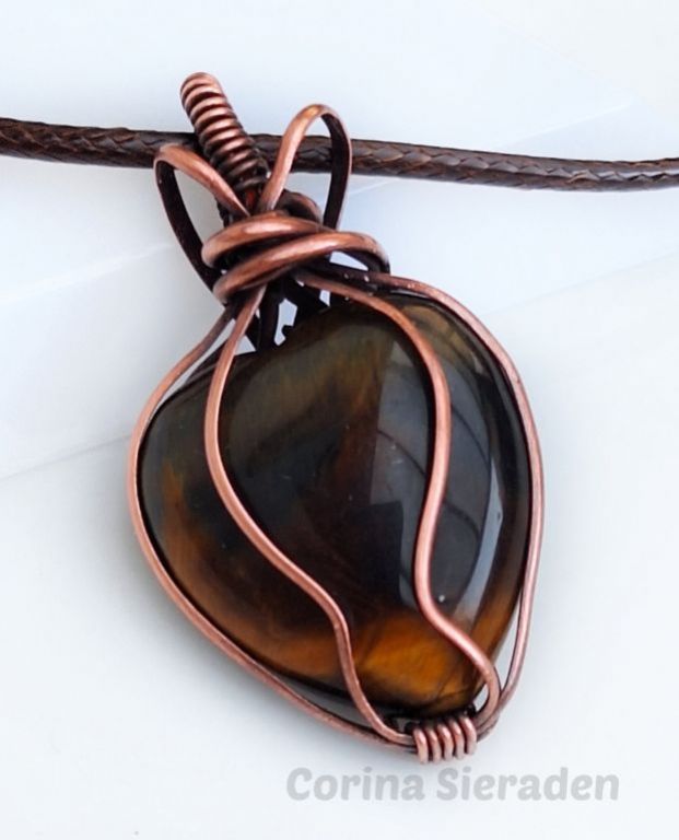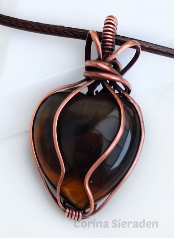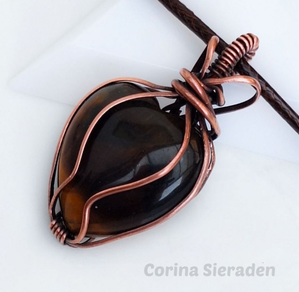 CORINA SIERADEN Wire wrapped hanger met tiger eye (hart) in geoxideerd koperdraad. Lengte steen: 2,5 cm, hanger: 4 cm.