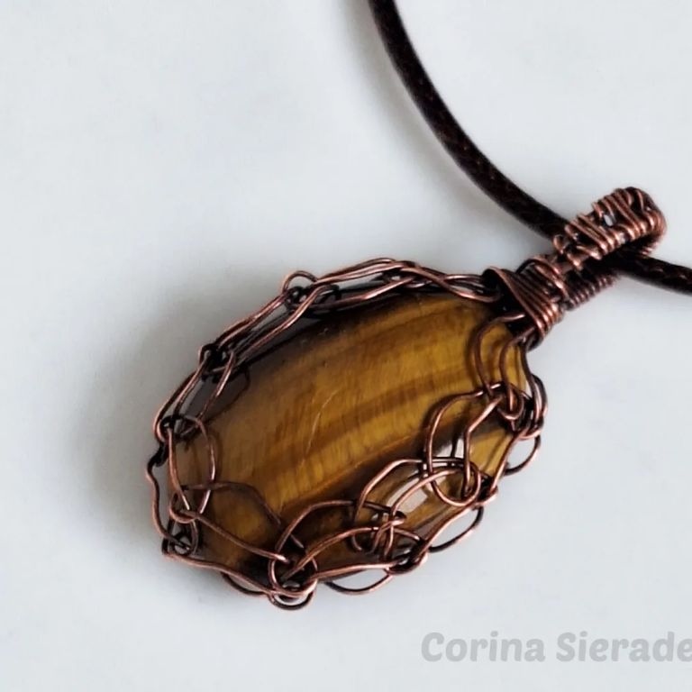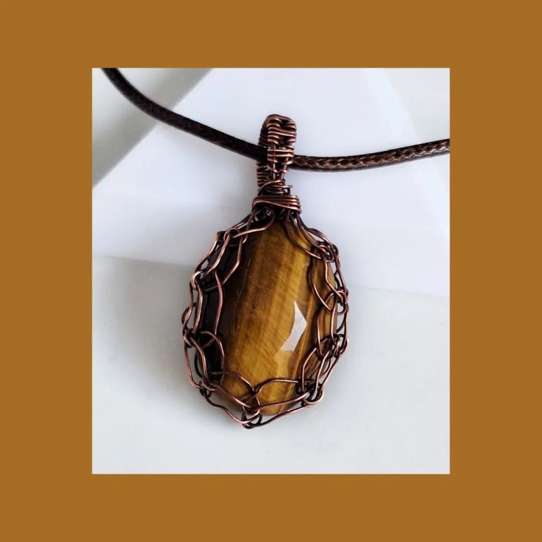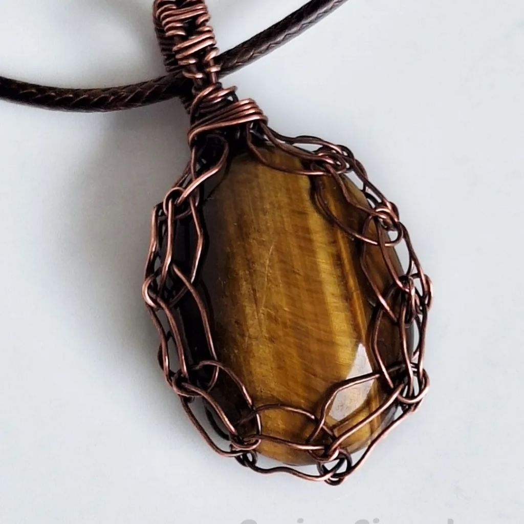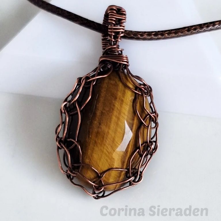 Wire wrapped hanger met bijzonder mooie tiger eye in geoxideerd koperdraad.
