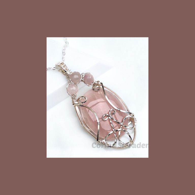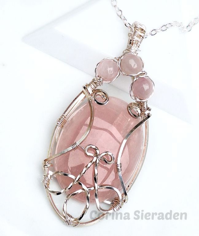 Prachtige wire wrapped hanger met rosequartz (cabochon 4 cm en facetgeslepen 8 mm) in STERLING ZILVERDRAAD.