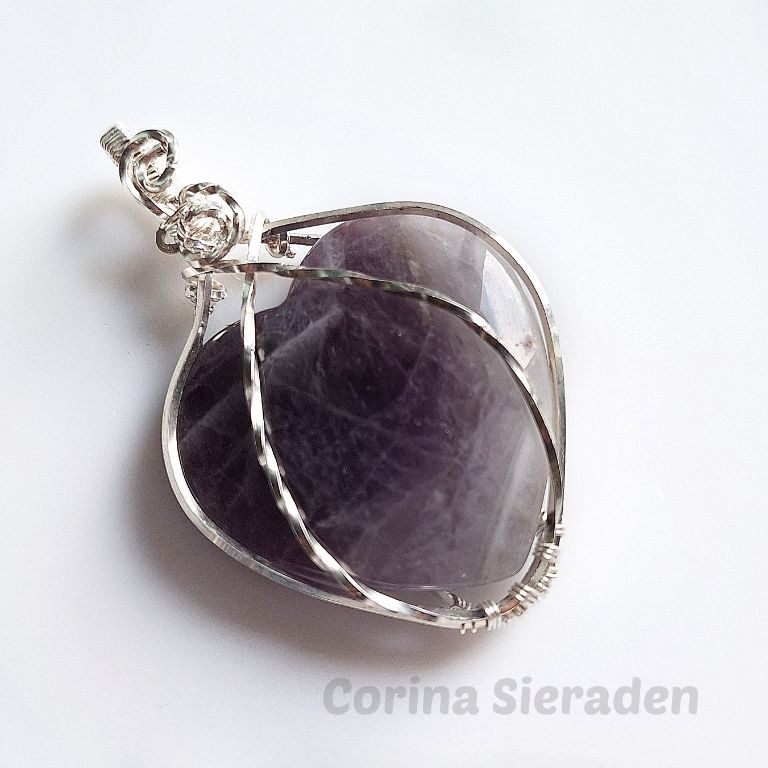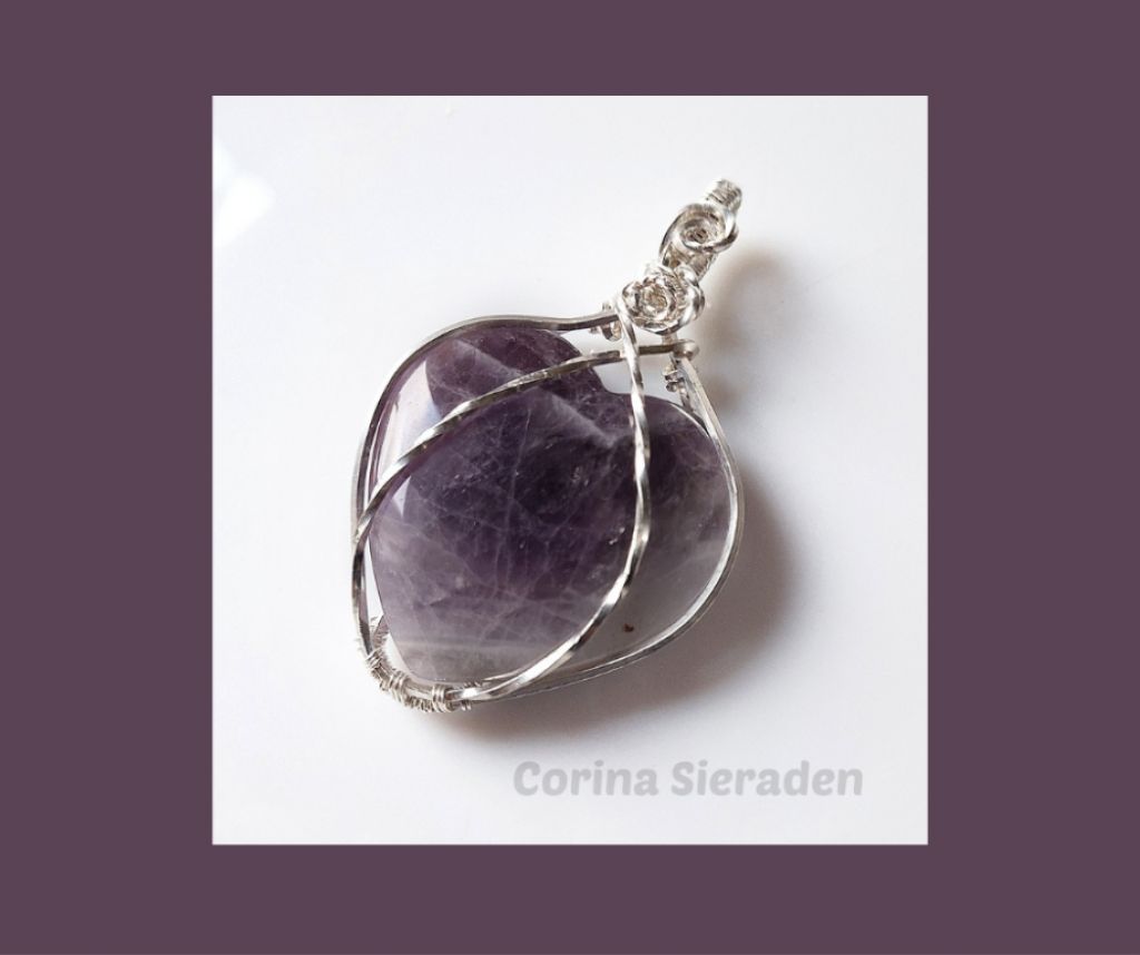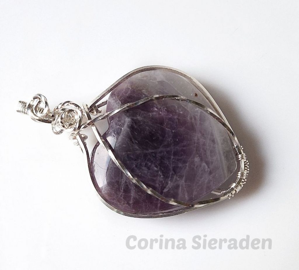 Prachtige wire wrapped hanger met een hartvormige amethist, gewikkeld in sterling zilverdraad. De hanger wordt geleverd met een verzilverd kettinkje, klaar om te dragen of cadeau te geven. Lengte steen: 4 cm, hanger: 6 cm.