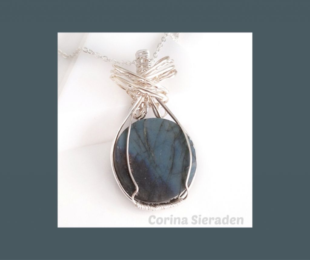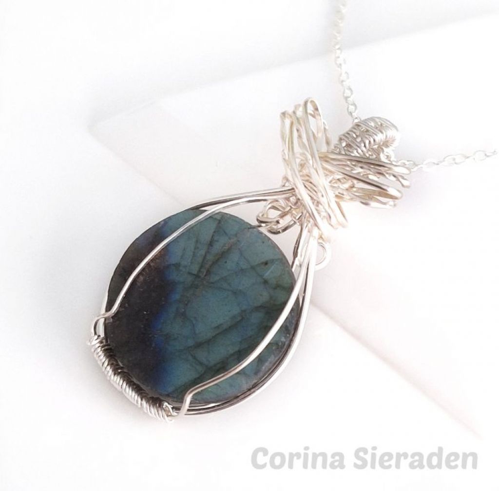Unieke wire wrapped hanger met ronde, ruwe labradoriet en prachtige flash, handgewikkeld in verzilverd koperdraad. Mystiek en stijlvol.
