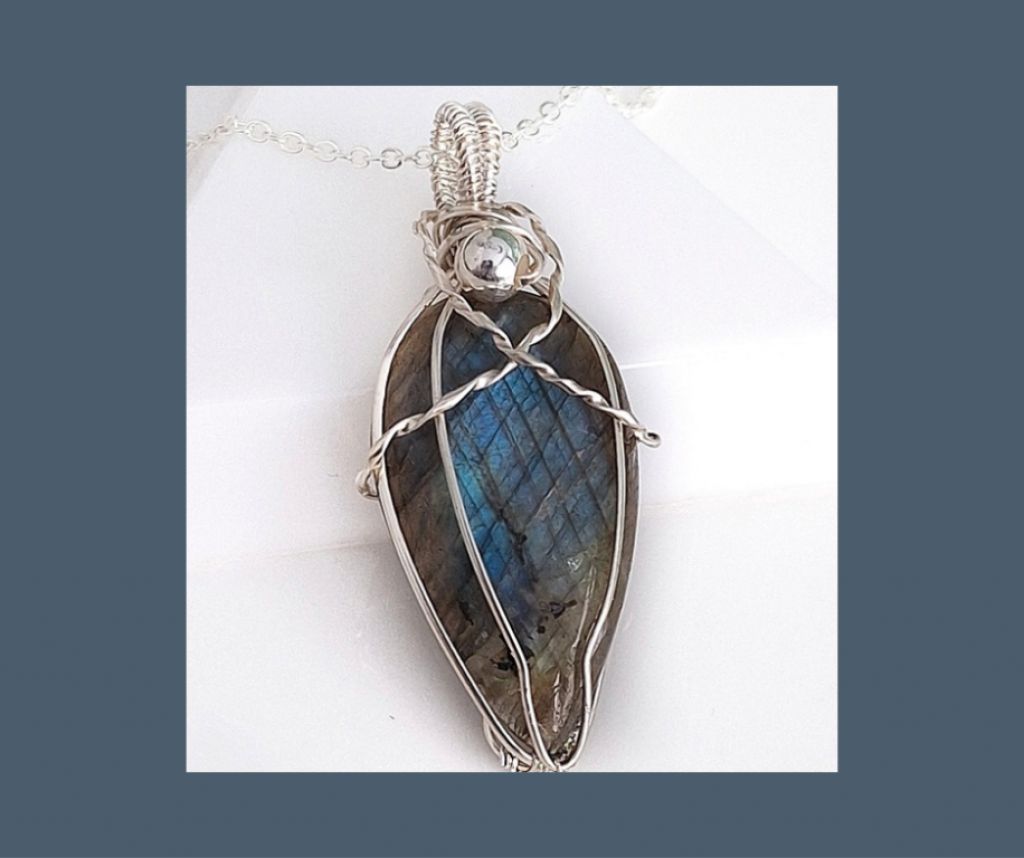 Wire wrapped hanger met labradoriet in verzilverd koperdraad. Een handgemaakt sieraad met mystieke uitstraling.