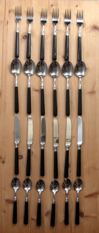 Dit robuuste, stijlvolle 24 delig roestvrijstaal met kunststoffen accenten stainless bestek is beslist zgan en prima te combineren met heel veel stijlen serviezen.