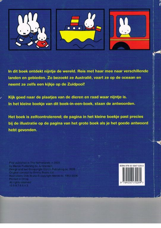 Uitg. Mercis 2006. Formaat ca. 21,5 x 26 cm. Het boek bestaat uit 6 kartonnen bladen, inclusief kaften. Men zou dus kunnen praten over 12 pagina's. In het midden, tegen de rug aan, zit een klein boekje met 5 kartonnen bladen (dus 10 pagina's). Er zijn dus talrijke selectie-mogelijkheden. Er zijn wat lichte gebruikssporen, voornamelijk bij de rug op de plek waar de bladen van het kleine boekje moeten worden gedraaid. Ik verwacht niet, dat een jong kind daar over gaat klagen. Gewicht 245 gram. Verzendkosten vanaf € 3,95. Prijs € 8,90.