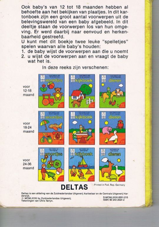 Uitg. Deltas. 1981. Formaat 15 x 19,5 cm. Kartonnen boekje bestaande uit 6 kartonnen bladen (dus 12 pagina's) inclusief kaften. Op alle bladen gekleurde afbeeldingen met teksten. Gebruikssporen o.a. sleet aan hoeken en randen, plastic vel van kaft laat wat los. Dikte 9 mm. Gewicht 142 gram. Verzendkosten vanaf € 3,95. Prijs € 1,50.