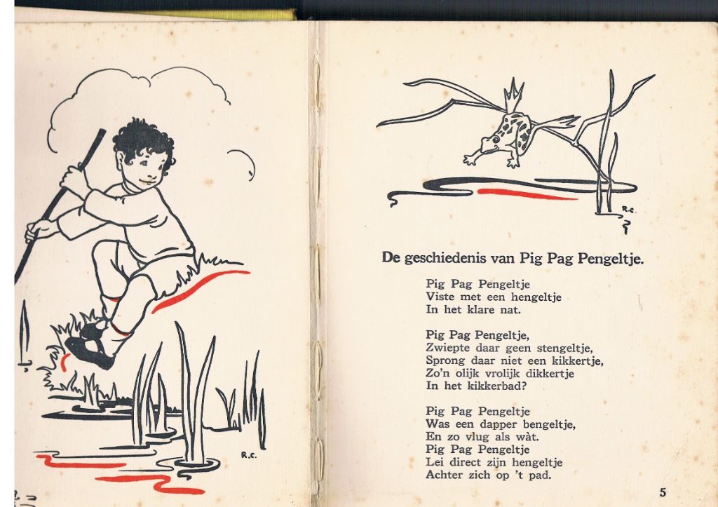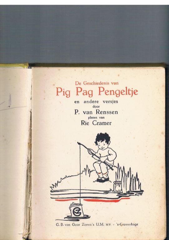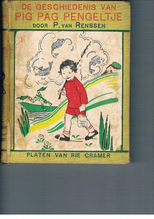 Door P. van Renssen. Platen van Rie Cramer. Uitg. Van Goor. 1936. Gebonden. 64 pagina's van vrij dik papier. Doordat het 1e schutblad is losgescheurd is er een spleet ontstaan tussen de voorkaft en het boekblok. Hetzelfde treffen wij ook achterin aan: kennelijk is het 3e schutblad er uitgescheurd. Alleen is hier de spleet wat kleiner. In het begin zitten er nog een paar pagina's wat los. Aan de voorzijde zit de rug slechts voor 3 cm vast. Halverwege heeft de rug nog een horizontale scheur. Maar als je niet zo scherp kijkt, zie je het niet. Hier en daar nog enkele lelijke plekjes. Maar verder heeft het boek de afgelopen 80 jaren aardig doorstaan. Prijs slechts € 9,95. Dikte 2 cm. Gewicht 438 gram. Verzendkosten vanaf € 4,35.
