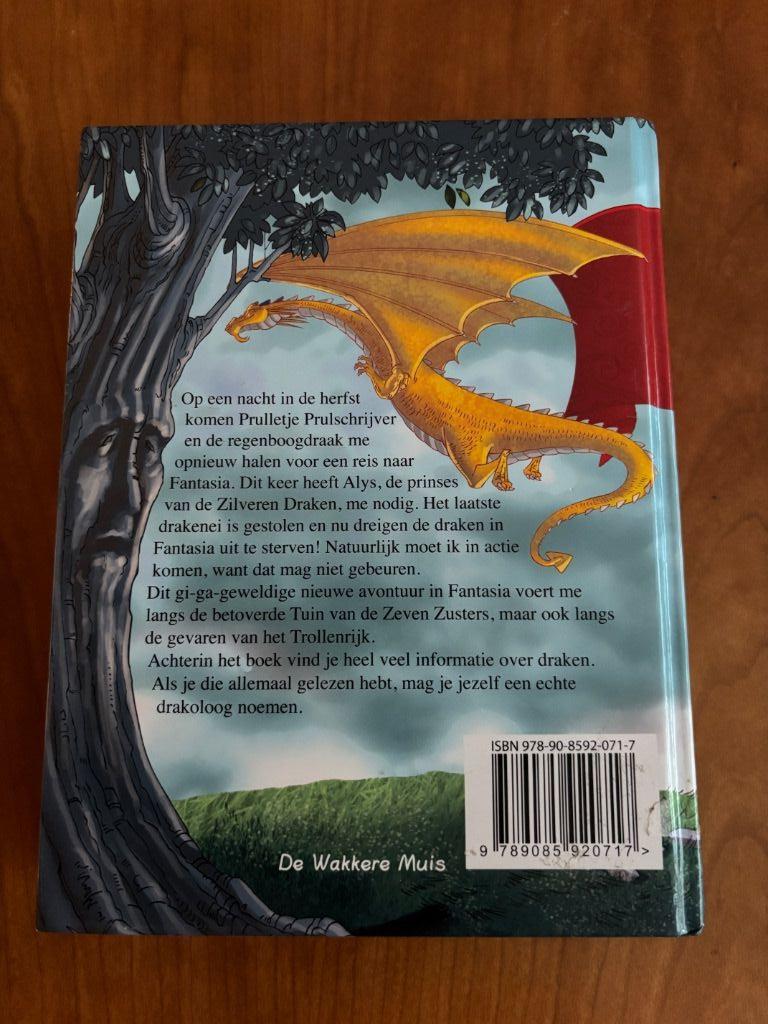 Op een nacht in de herfst komen Prulletje Prulschrijver en de Regenboogdraak me opnieuw halen voor een reis naar Fantasia. Dit keer heeft Alys, de prinses van de zilveren draken me nodig. Het laatste drakenei is gestolen, en nu dreigen de draken in Fantasia uit te sterven! Natuurlijk moet ik in actie komen, want dat mag niet gebeuren. Dit gi-ga-geweldige nieuwe avontuur in Fantasia voert me langs de betoverde tuin van de Zeven Zusters, maar ook langs de gevaren van het Trollenrijk.