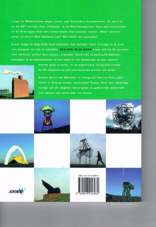 Vijf-en-tachtig kunstobjecten vanuit de auto. Uitg. ANWB. 1e druk 2003. Gelijmd. 96 pagina's. Voorzien van talrijke kleurenfoto's van kunstobjecten langs de weg. Nieuwstaat. Gewicht 292 gram. Prijs € 3,95. Verzendkosten vanaf € 3,48.