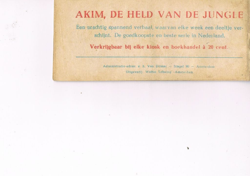 Tekenaar/schrijver Augusto Pedrazza /Roberto Renzi. Uitg. Walter Lehning. 1953. Standaard formaat 17 x 7,7 cm. Variant A (achterzijde Akim, de held van de jungle). Lichte gebruikssporen, o.a. ter versteviging gelijmd bij de rug ...