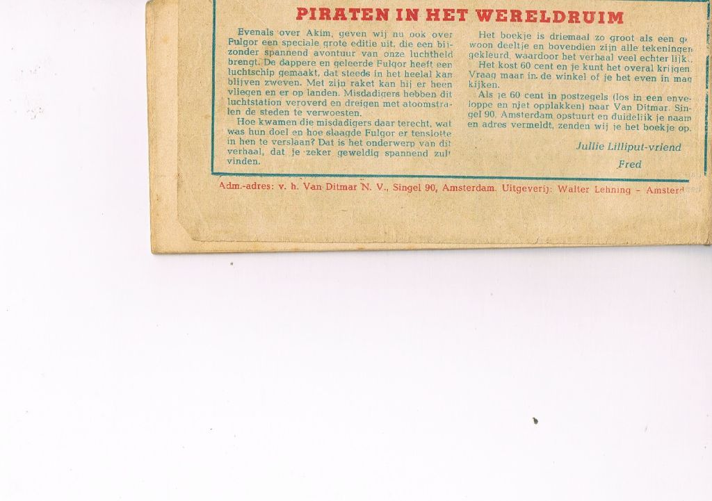 Tekenaar/schrijver Augusto Pedrazza /Roberto Renzi. Uitg. Walter Lehning. 1954. Standaard formaat 17 x 7,7 cm. Boekje ligt los in de kaften. Gedeelte achterkaft afgescheurd. Restant van achterkaft ook wat beschadigd. Gewicht 14 gram. ...
