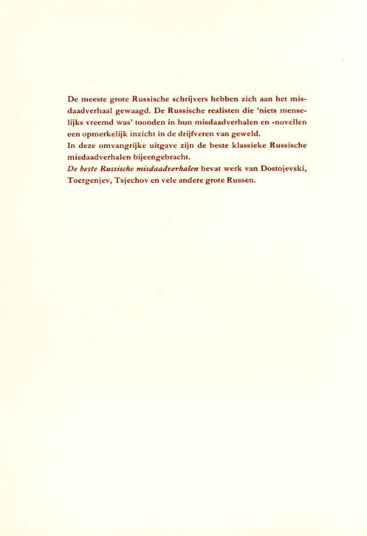 Elf verhalen, grotendeels uit de klassieke periode van de Russische literatuur met als gezamenlijk thema de misdaad.