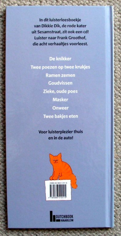 In dit luisterleesboekje van Dikkie Dik, de rode kater uit Sesamstraat, zit ook een cd! Luister naar Frank Groothof, die acht verhaaltjes voorleest