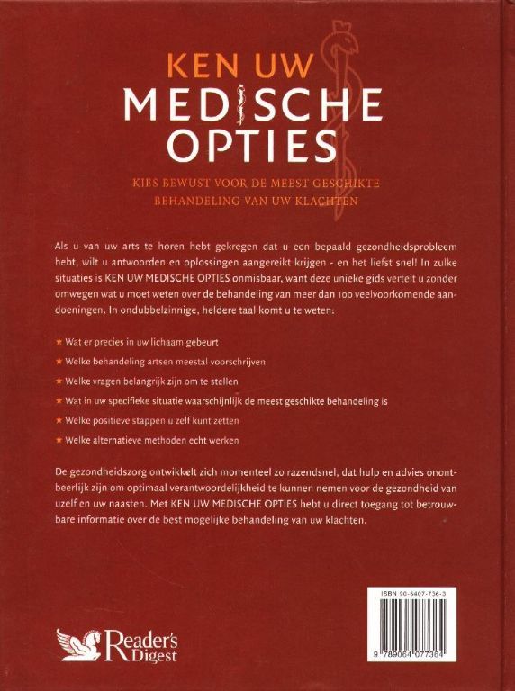Als u van uw arts te horen hebt gekregen dat u een bepaald gezondheidsprobleem hebt, wilt u antwoorden en oplossingen aangereikt krijgen - en het liefst snel! In zulke situaties is KEN UW MEDISCHE OPTIES onmisbaar, want deze unieke gids vertelt u zonder omwegen wat u moet weten over de behandeling van meer dan 100 veelvoorkomende aandoeningen.