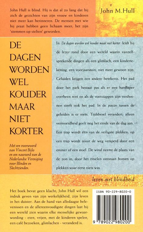 Het boek bevat geen klacht; John Hull wil een indruk geven van zijn werkelijkheid, zijn ]even in het duister.
