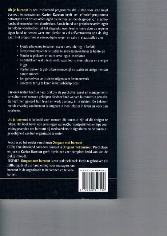 Psychologe en juriste Carien Karsten heeft een programma ontworpen om mensen weer op de rails te krijgen. Dit boek is in 2008 uitgegeven door uitgeverij Elmar. Nieuwstaat, echter met een klein vouwtje op de achterzijde. Dikte 1,3 cm. Gewicht 298 gram. Verzendkosten vanaf € 3,95. Prijs € 12,50.