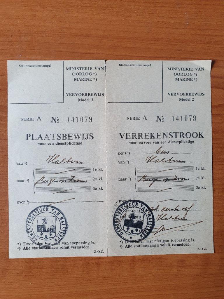 Plaatsbewijs + verrekenstrook voor een dienstplichtige