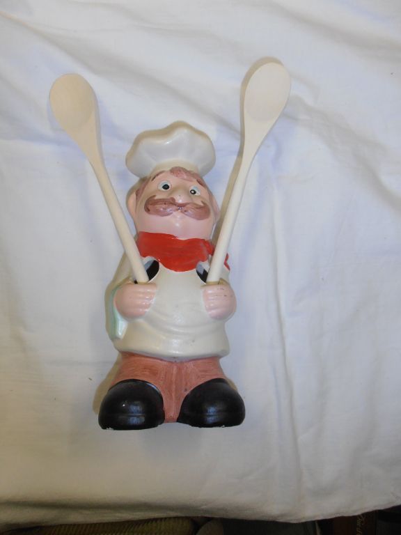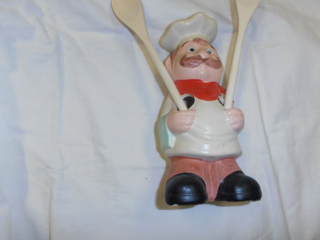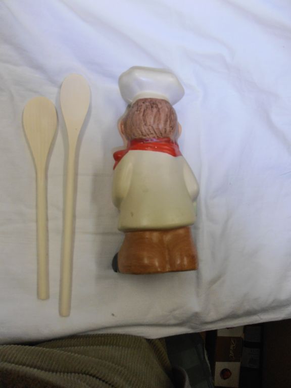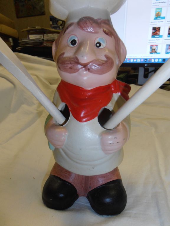 Materiaal doet denken aan kalk, maar aan het geluid te oordelen is het metaal. Hoogte kok 23,5 cm. Van voor naar achter ca. 9 cm. Staat: zo goed als nieuw. Geschatte leeftijd ca. 30 tot 40 jaar. De pollepels zijn nieuw en mogelijk een jaar oud. Gewicht kok 511 gram. Twee pollepels 30 gram. Lengte 30,5 en 25 cm. Prijs € 14,95. Verzendkosten vanaf € 4,50.
