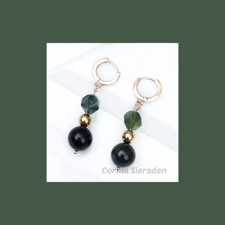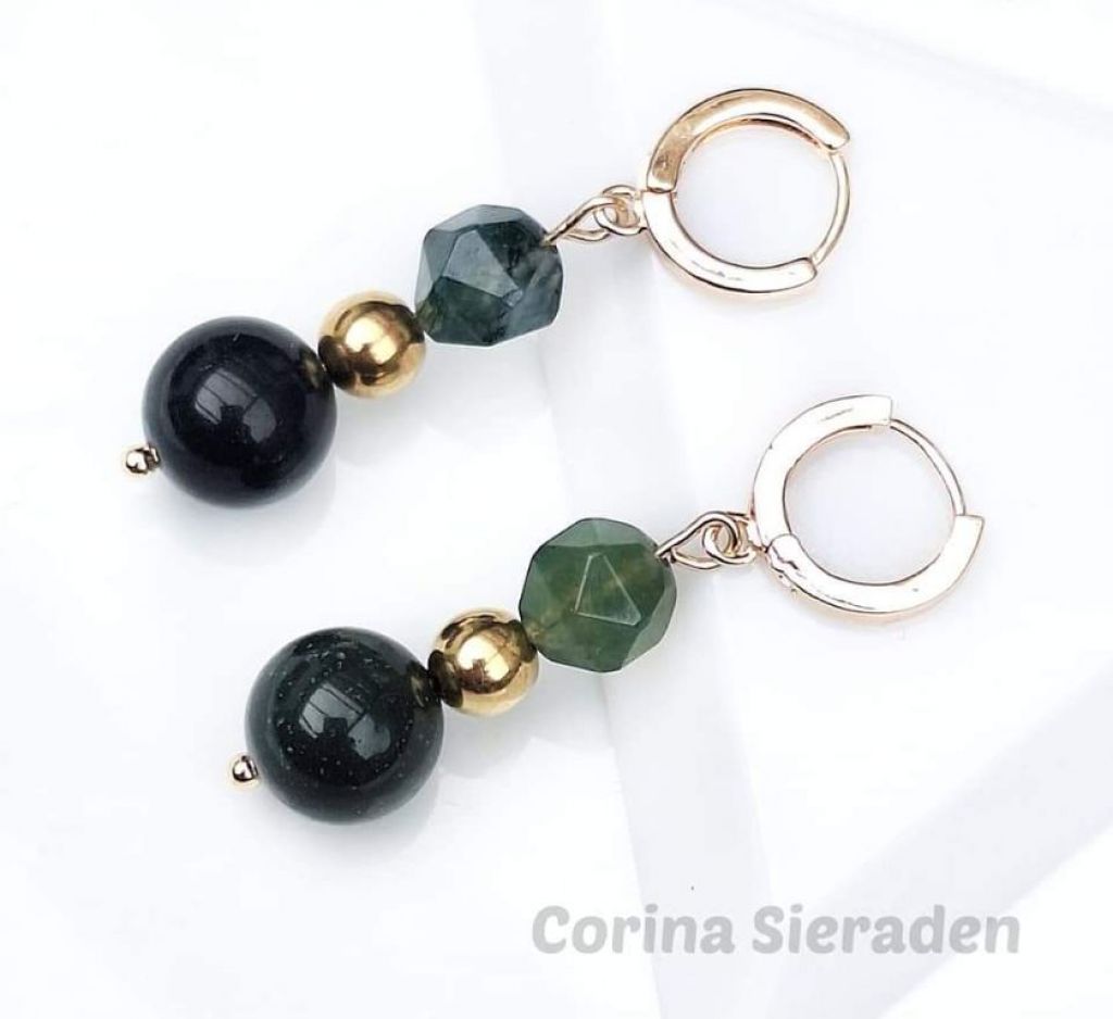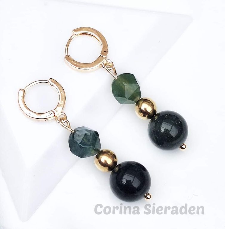 CORINA SIERADEN Messing oorringen met mosagaat. Lengte: 4 cm.