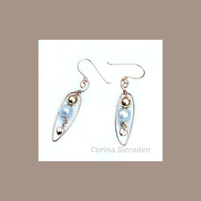Deze unieke, wire wrapped oorhangers zijn gemaakt met een prachtige grijze parel (10 mm), een messing kraal (8 mm) in messing draad en heeft een bedeltje.