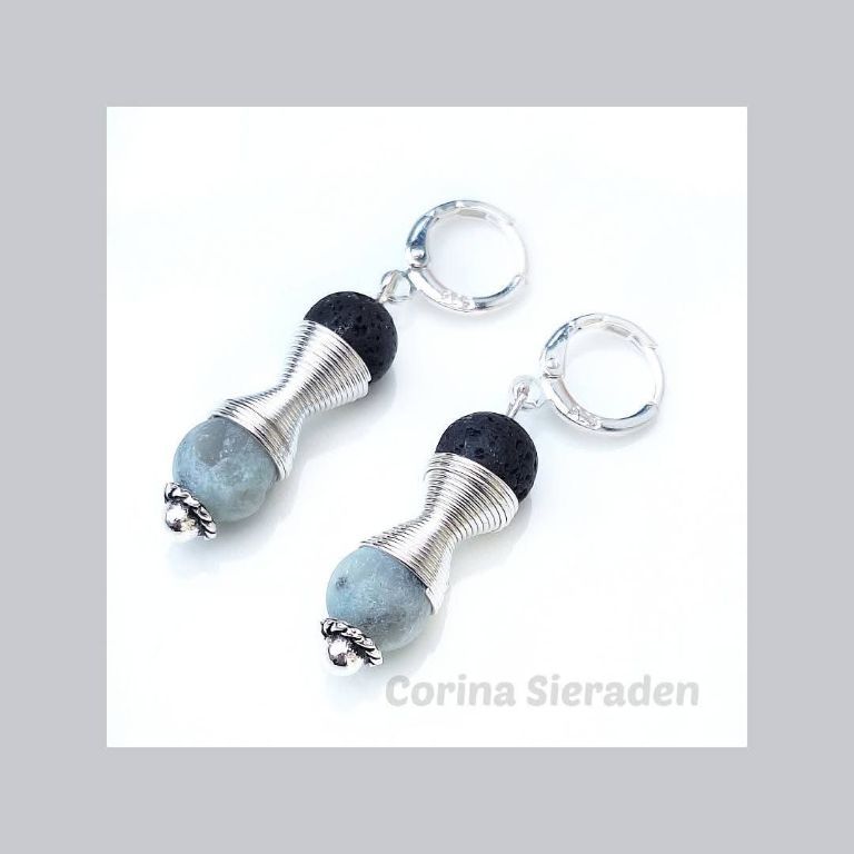 CORINA SIERADEN Sterling zilveren oorringen met frosted jaspis, lavasteen en hematiet, met tussenstuk van RVS.
