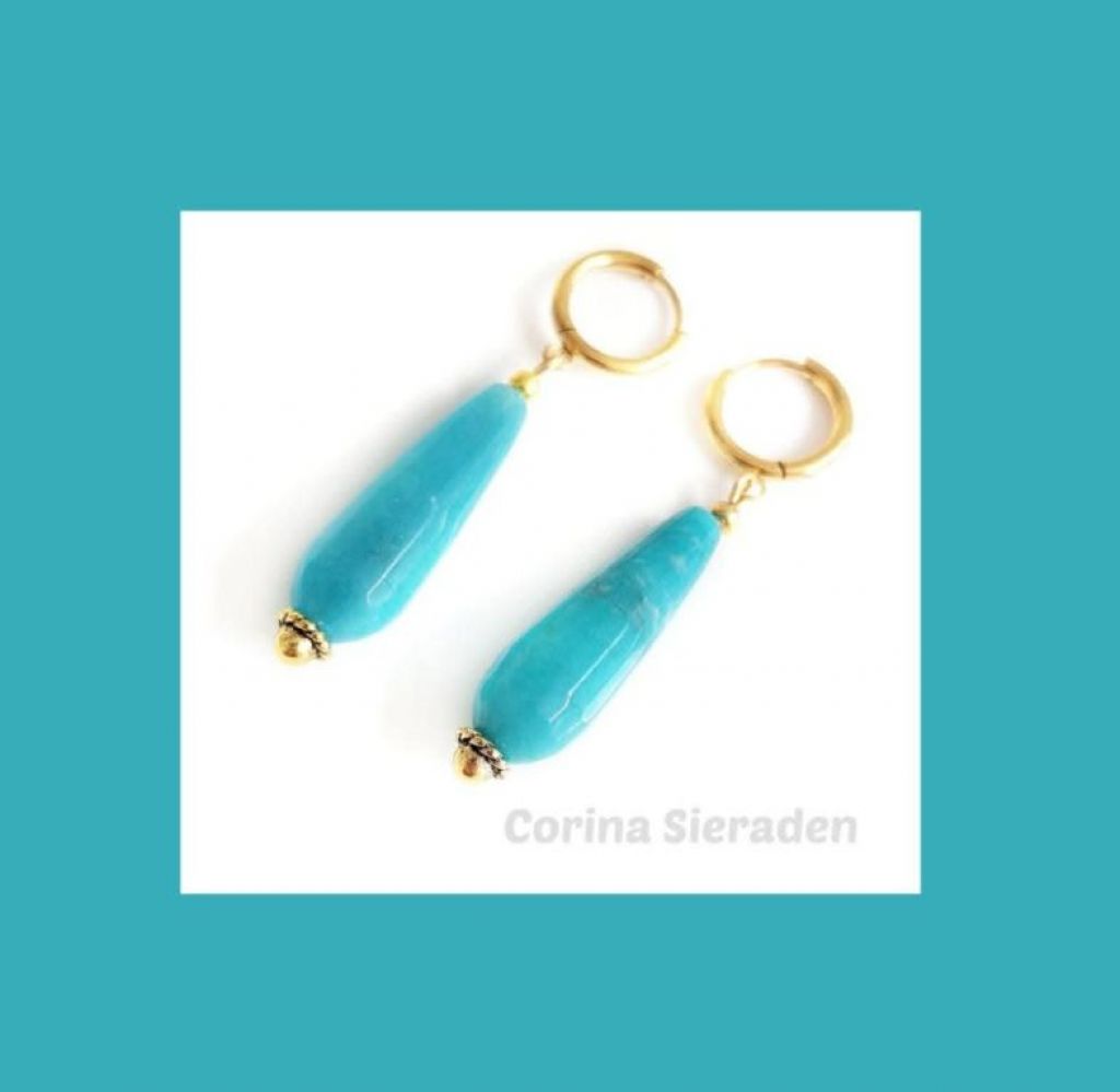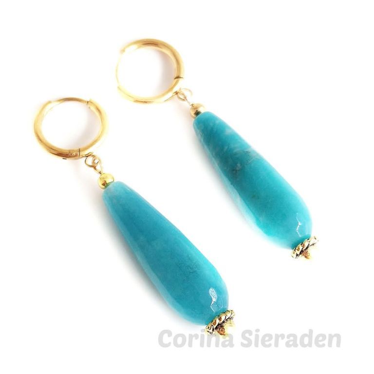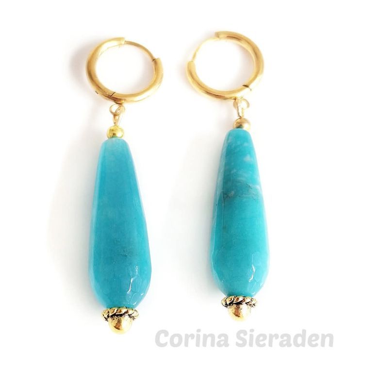 Zomerse oorringen met facetgeslepen blue angeliet druppels (10×30 mm).