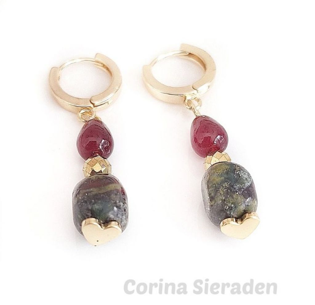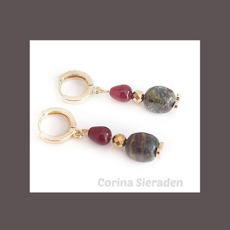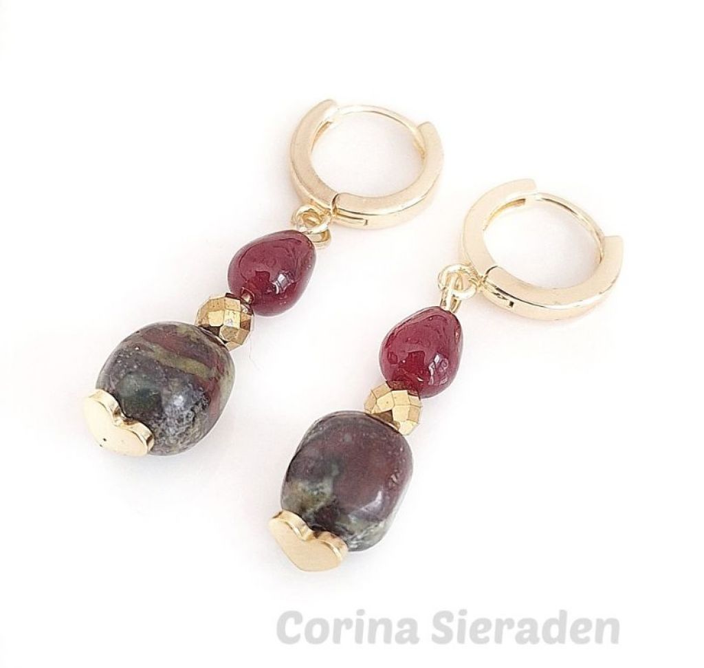 Messing oorringen met prachtige, onregelmatige dragon blood kralen, bloedrode chalcedoon (druppels) en goudkleurige facetgeslepen hematiet.