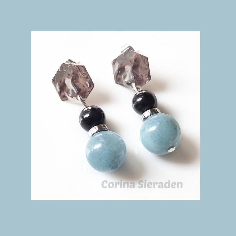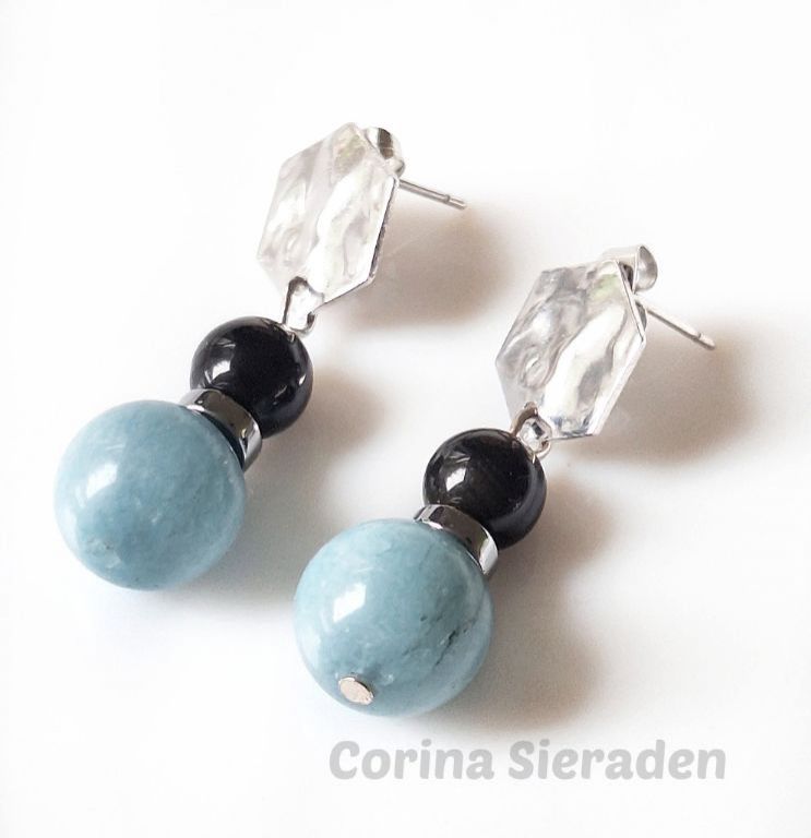 CORINA SIERADEN RVS oorstekers met aquamarijn, obsidiaan en hematiet.