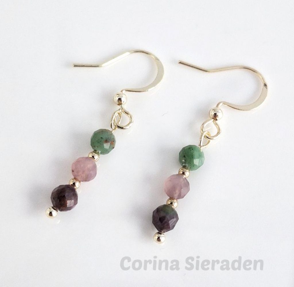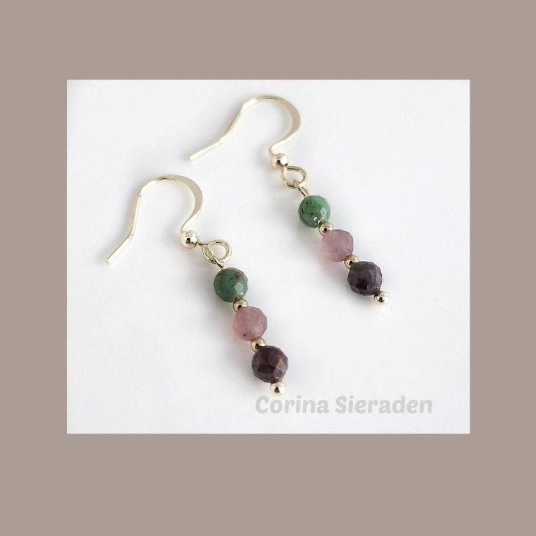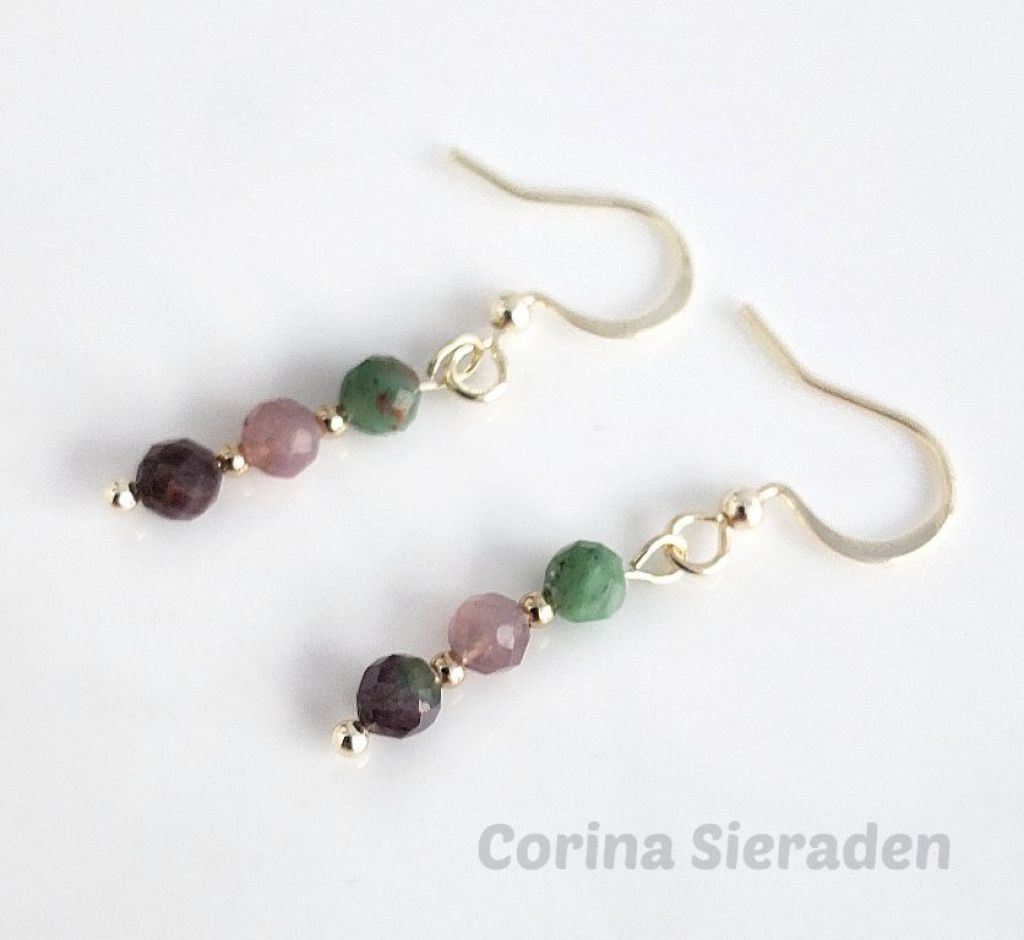 CORINA SIERADEN Goldplated oorhangers met facetgeslepen ruby zoisiet (4 mm), facetgeslepen rosequartz (4 mm) en goldplated spacers. Lengte: 3,5 cm.