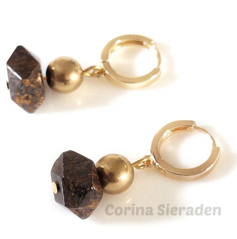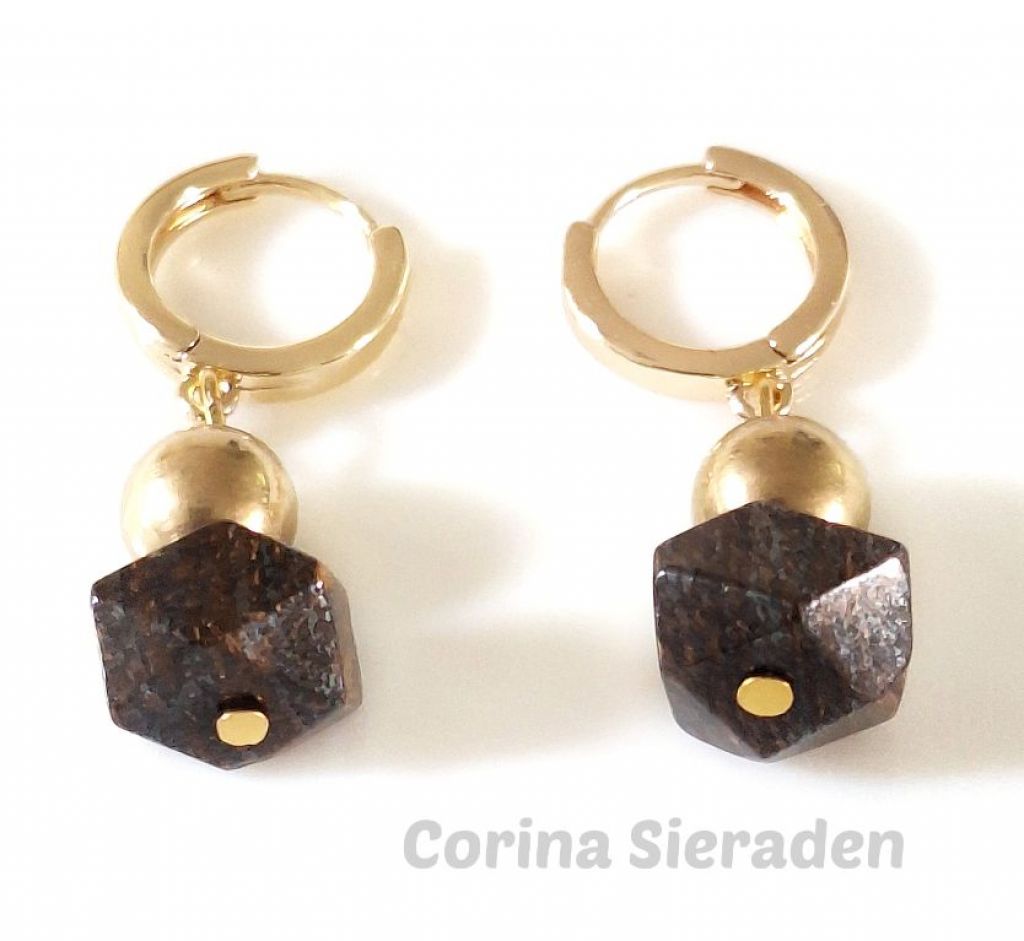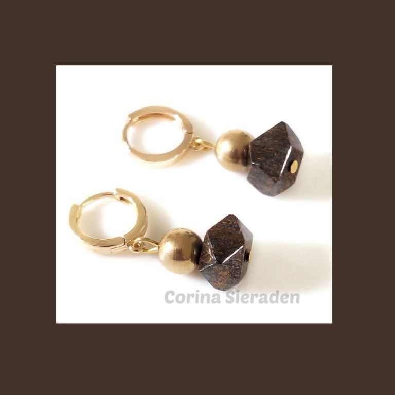 CORINA SIERADEN Bronzen oorringen met coffee agaat, citrien rondelle en bronzen spacers. Lengte: 3,5 cm.