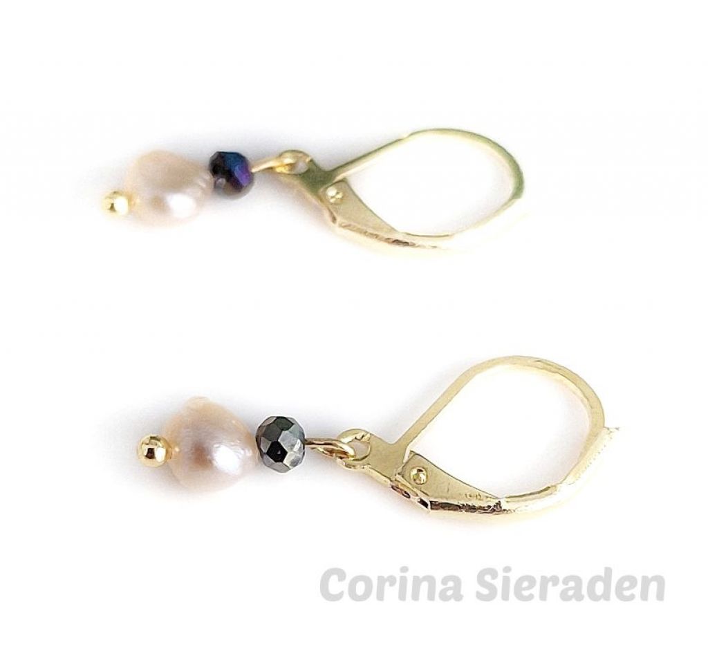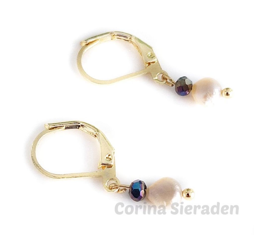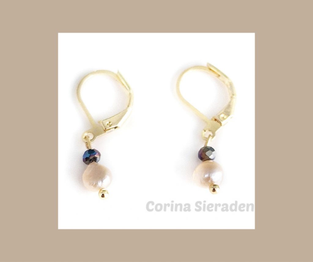 CORINA SIERADEN Goldplated oorringen met champagnekleurige zoetwaterparels en kristallen facetkraaltjes.
