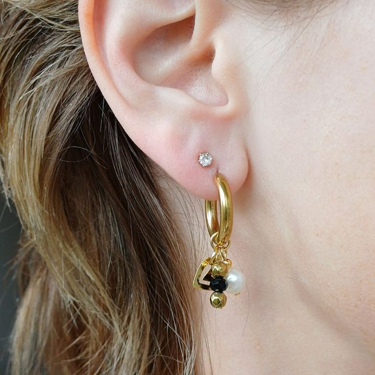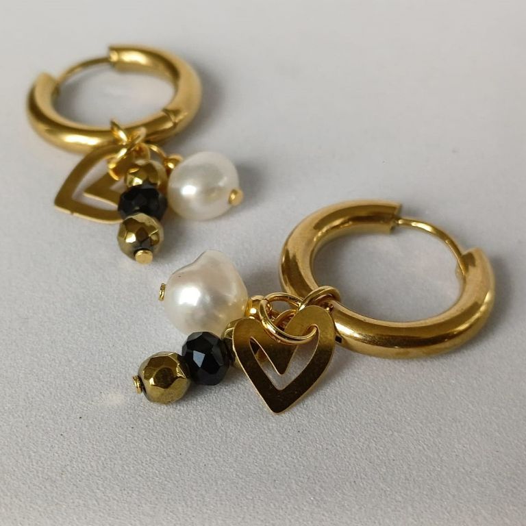 Deze stijlvolle, handgemaakte oorbellen combineren minimalisme met een unieke twist. De goudkleurige stainless steel hoops zijn verrijkt met natuurlijke elementen: een witte zoetwaterparel, goudkleurige Hematiet kralen, zwarte facetkralen en een speelse gouden hartbedels.
