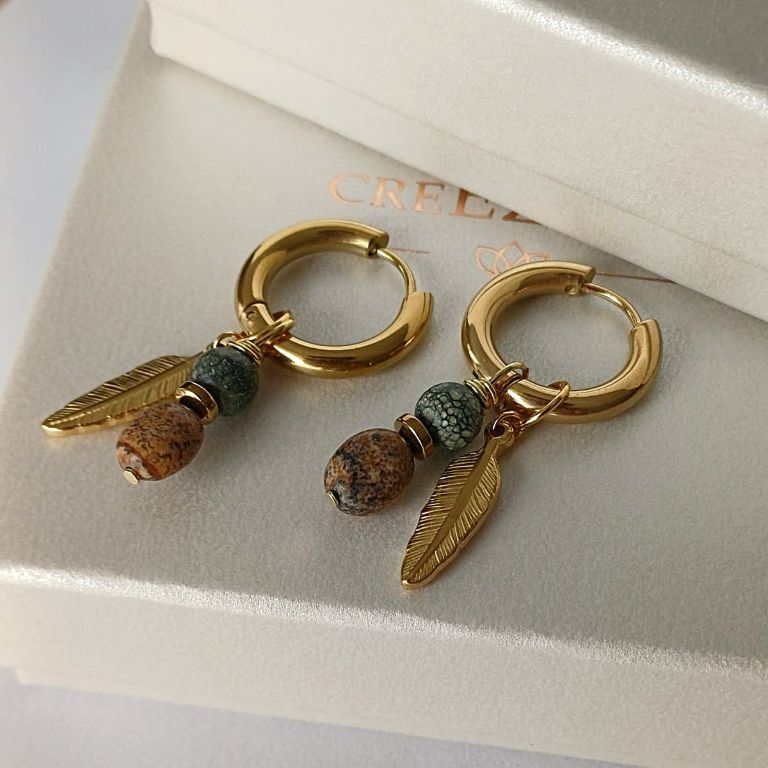 Het design bestaat uit RVS oorrigen met een lichte glans met de combinatie van de natuurlijke edelstenen. De jaspis kralen geven een robuuste en aardse uitstraling, terwijl de mos agaat kalen rust en harmonie geven aan het geheel. De bedel van de veer zorgt voor een speels detail.