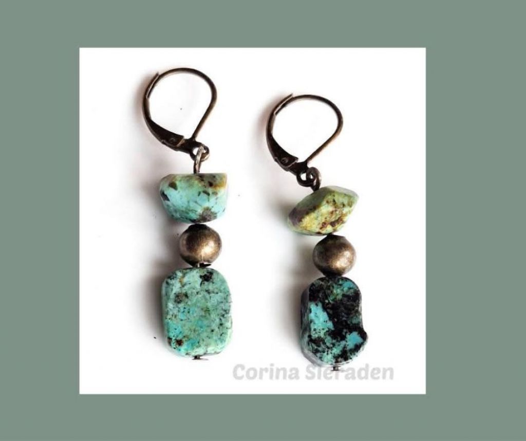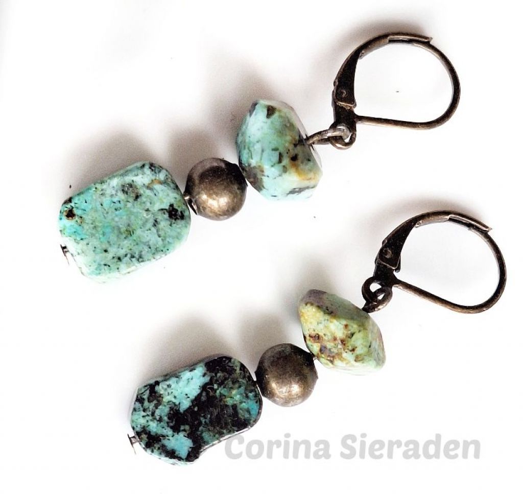 CORINA SIERADEN Bronzen oorringen met african turkoois en bronzen spacers. Lengte: 4 cm.
