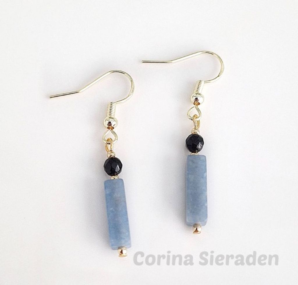 CORINA SIERADEN Vergulde oorhangers met blauwe aventurijn en facetgeslepen chalcedoon. Lengte: 4,5 cm.