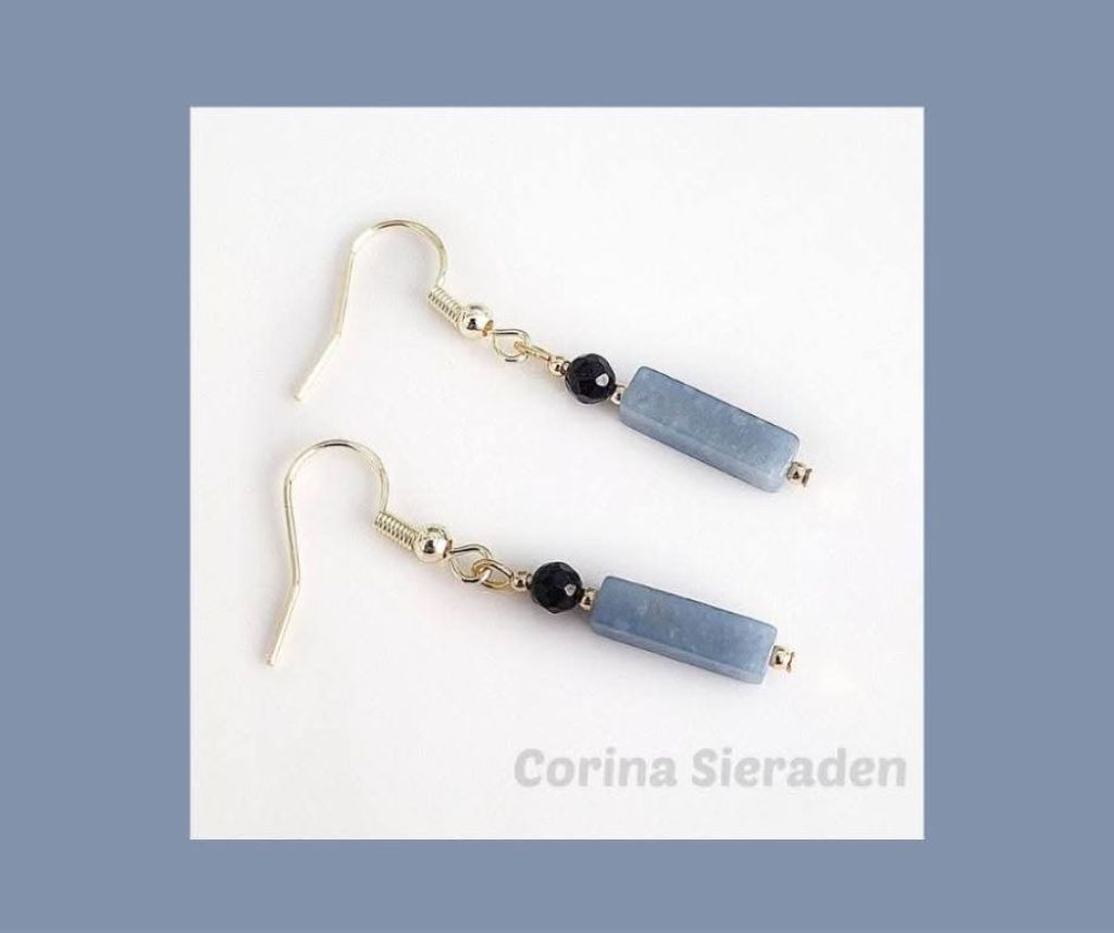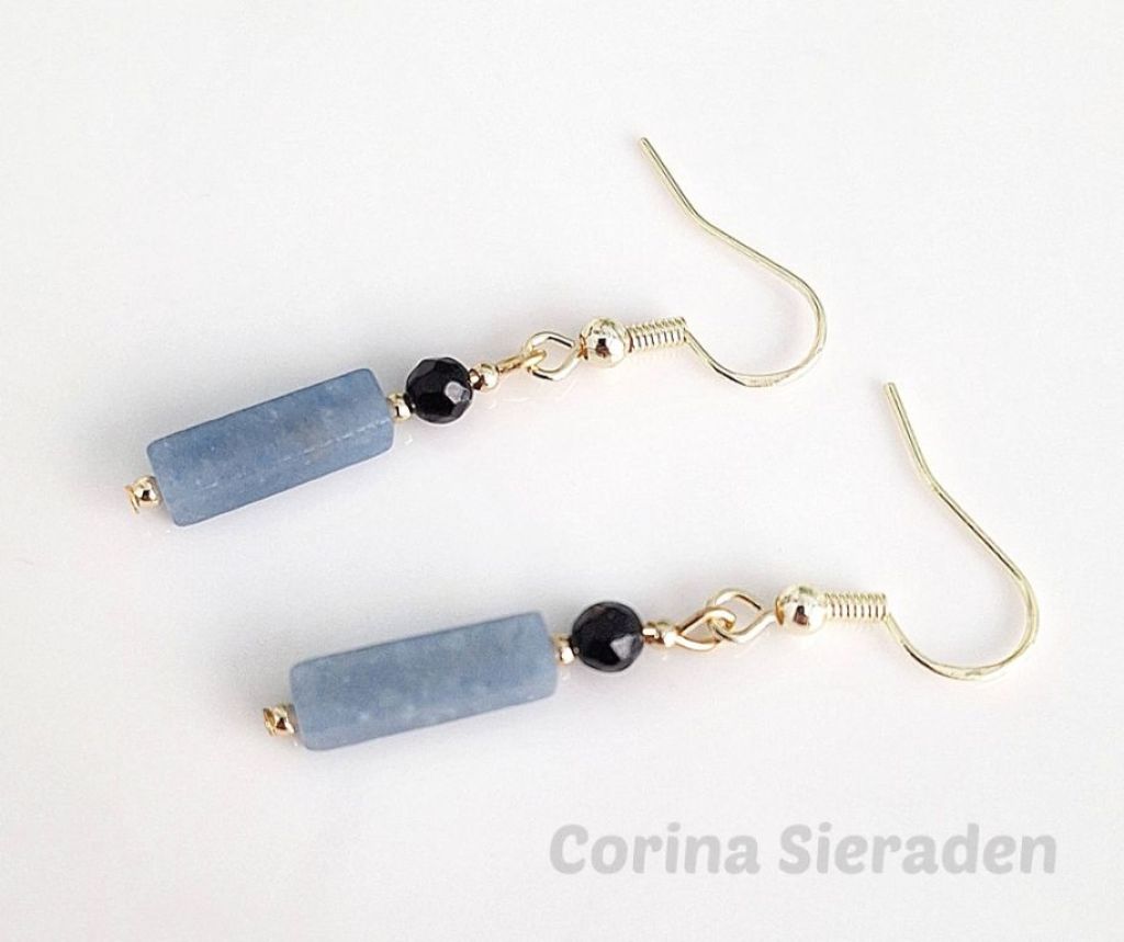 CORINA SIERADEN Zilveren oorhangers met tanzaniet en verzilverde hematiet spacers. Lengte: 3,5 cm.