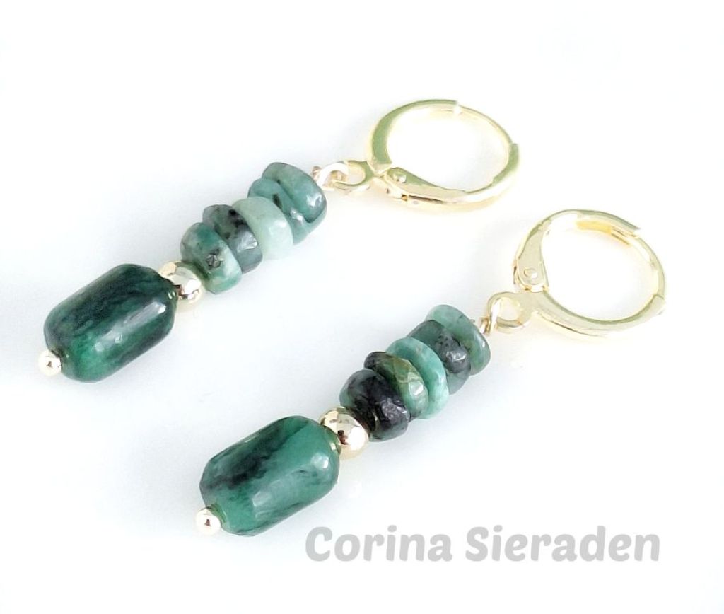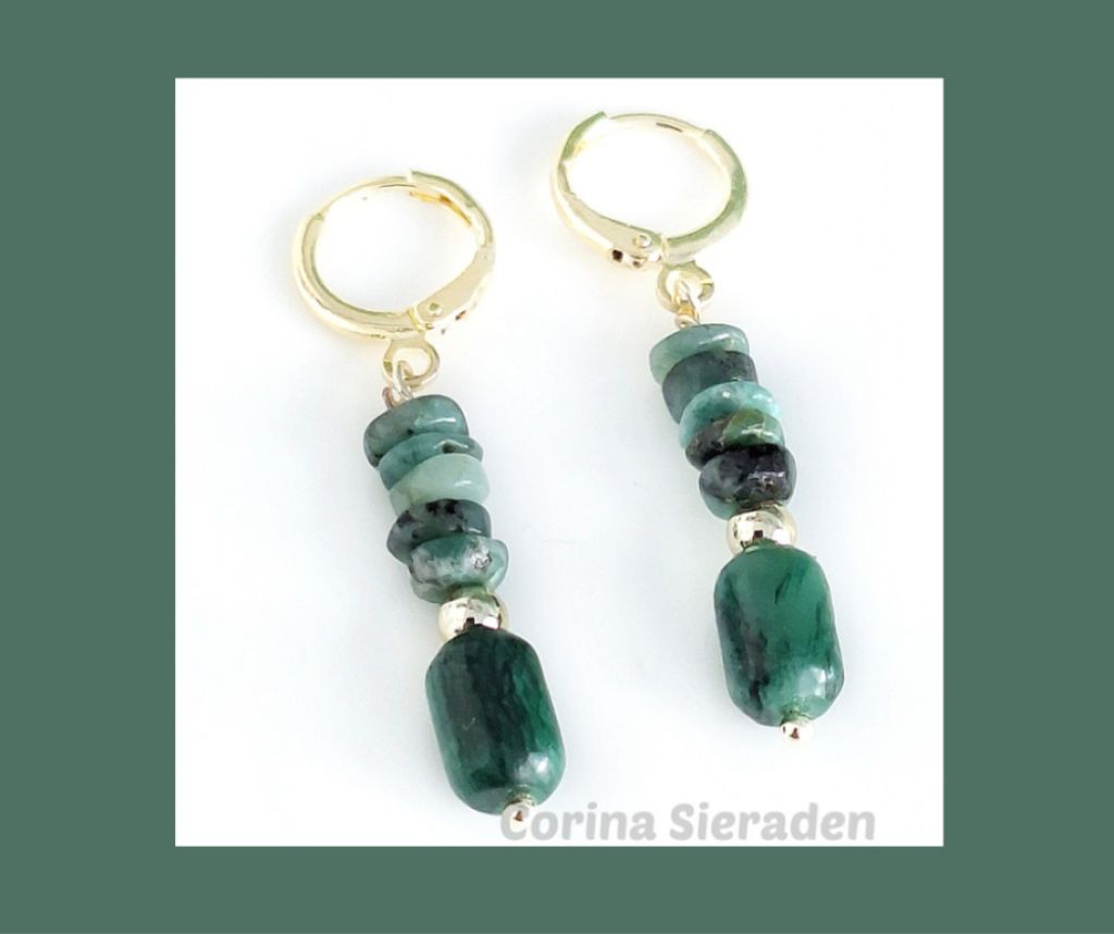CORINA SIERADEN Vergulde oorringen met smaragd en vergulde, gedraaide tussenkralen. Lengte: 4 cm.